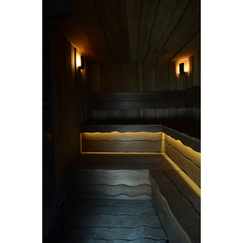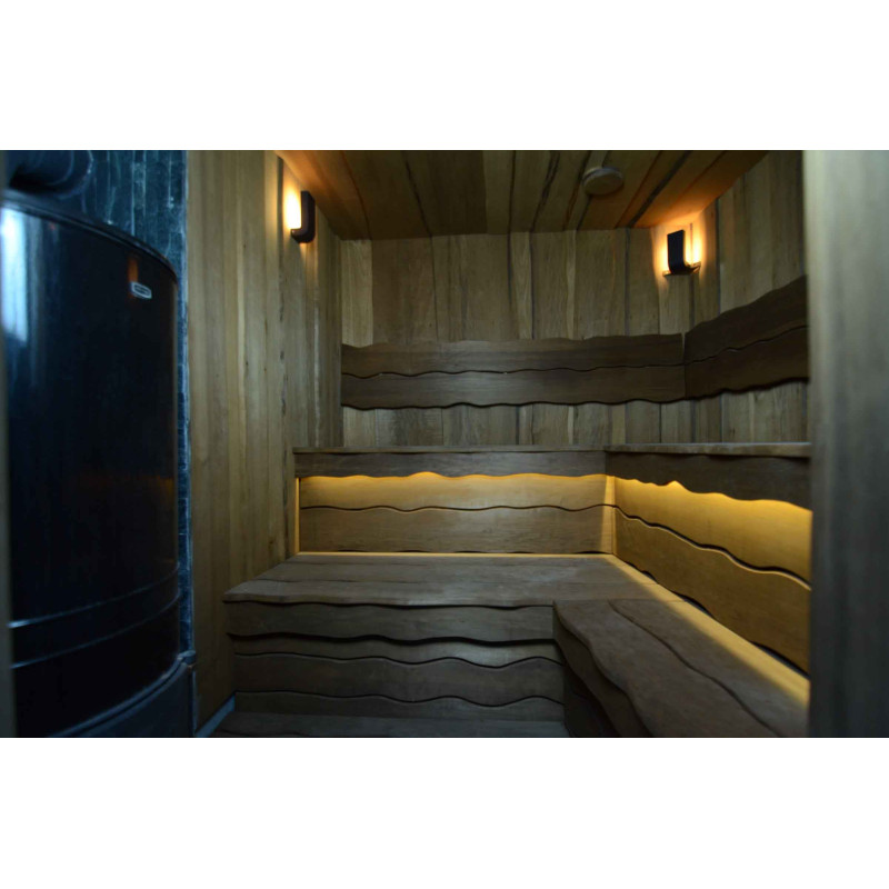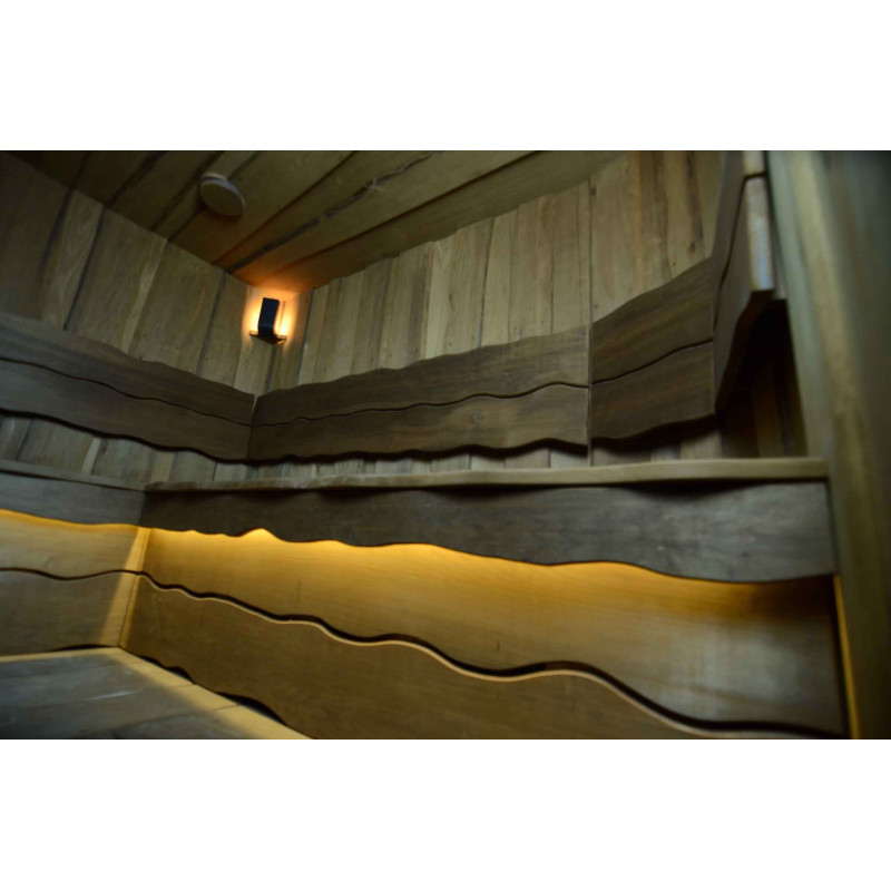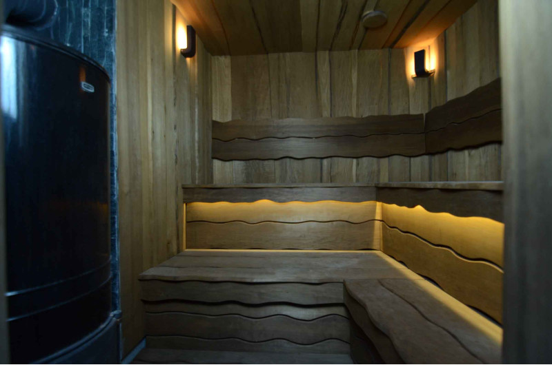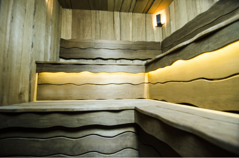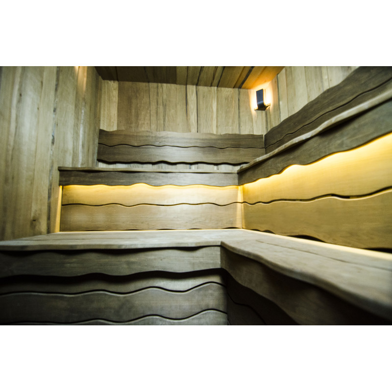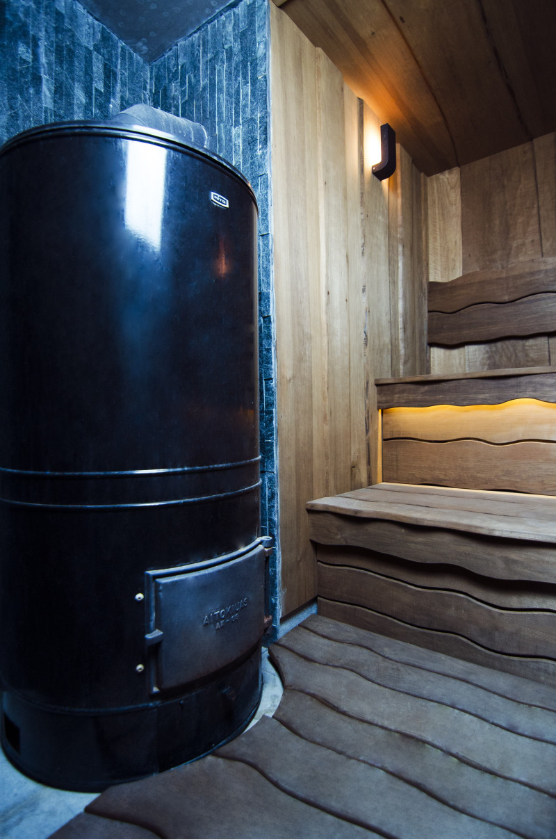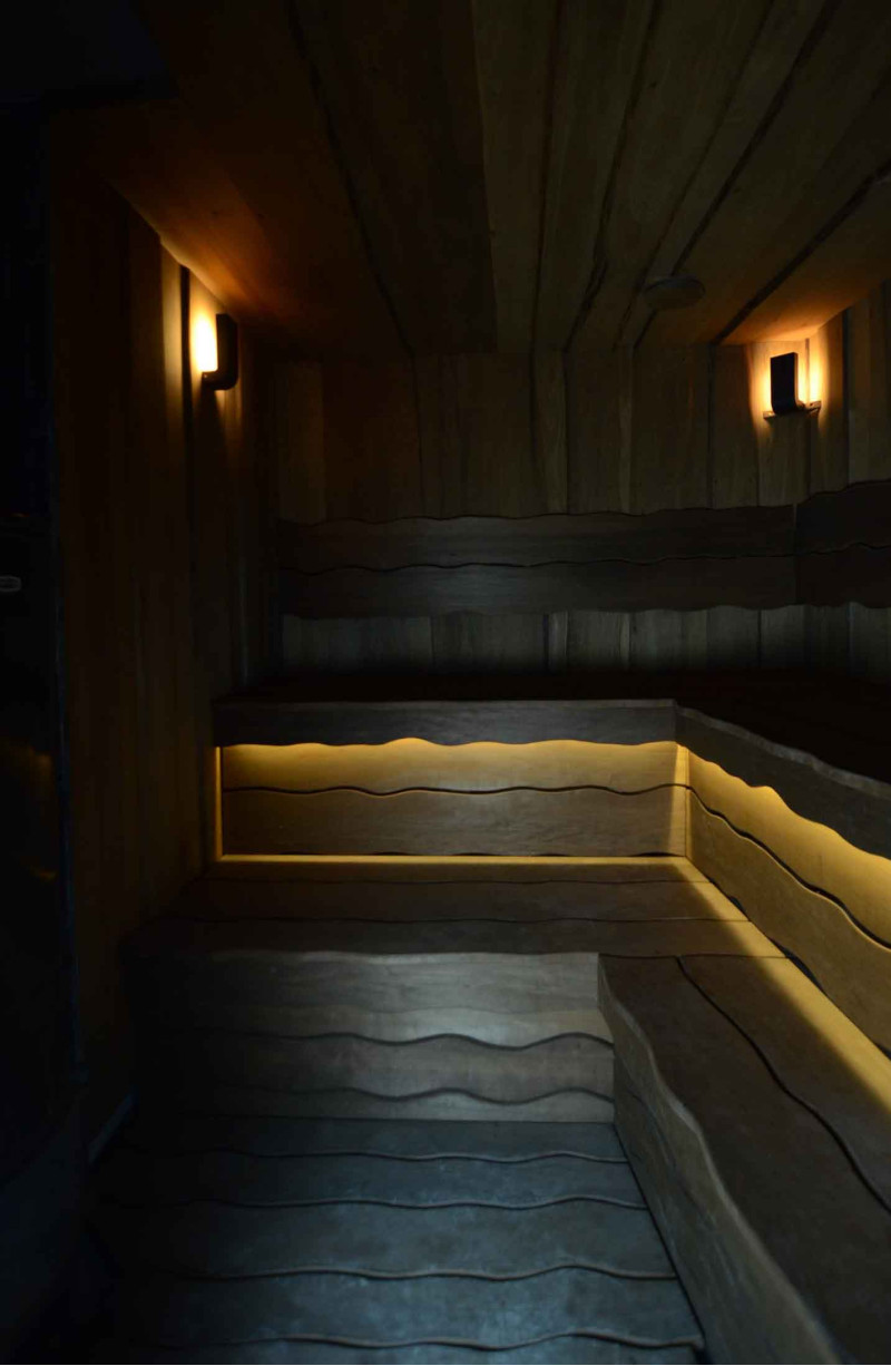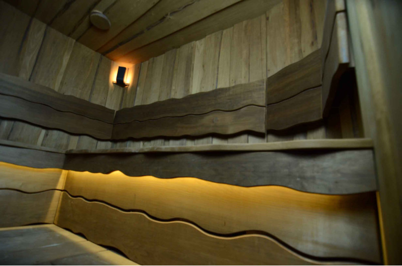 Spálené osikové drevo bolo použité na dekoráciu stien a stropu sauny, ako aj lavíc a operadiel. Hobľované dosky s jedným rezom boli zvolené tak, aby dodali saune útulnosť a prirodzenosť.