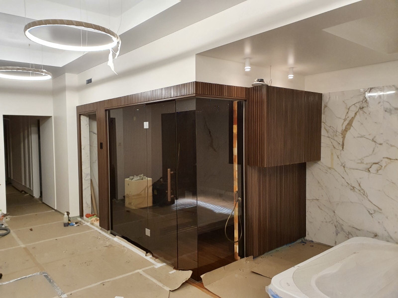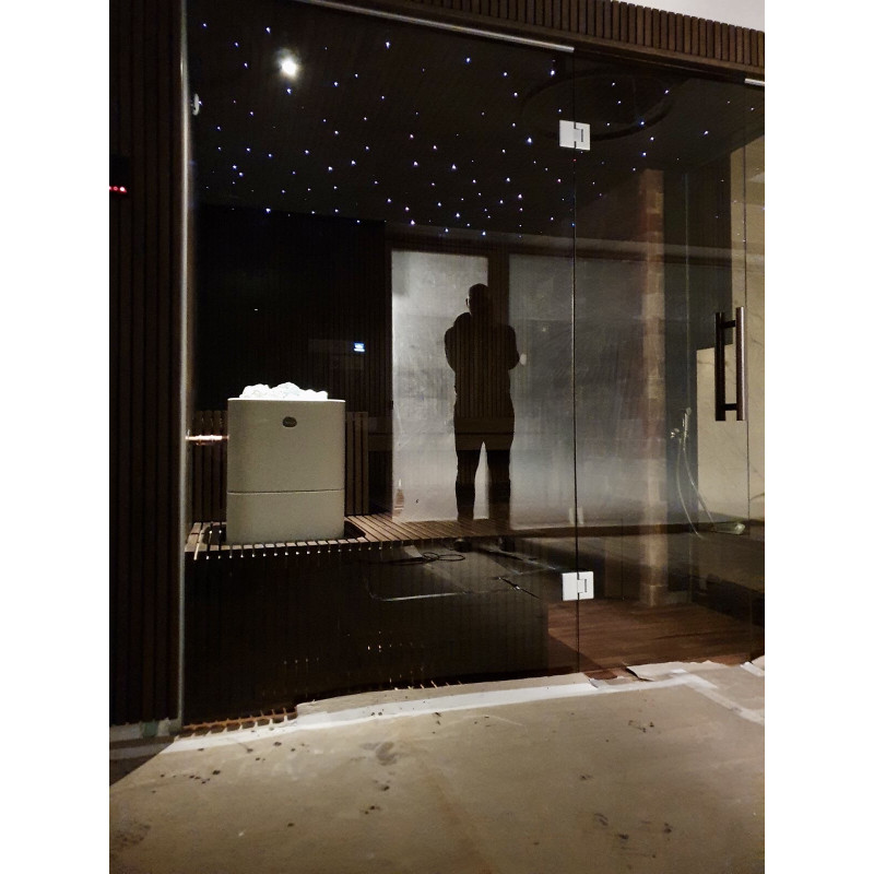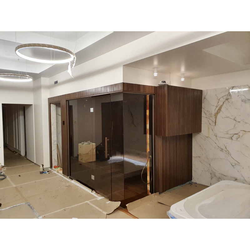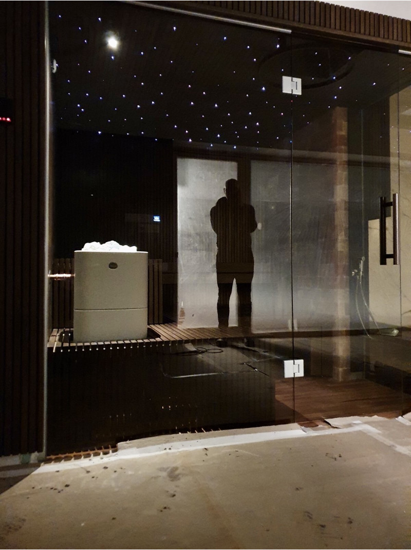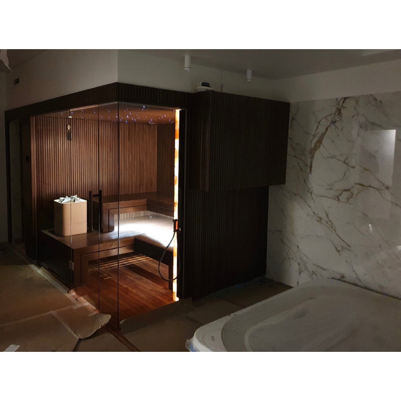 Vo Vilniuse bol realizovaný individuálny projekt sauny. Výberové lipové drevo pokryté prírodným voskom s farbou. Biely ohrievač Tulikivi Kuura 2 so samostatným parným generátorom tureckých kúpeľov (Harvia 4,5 kW) zavedeným do ohrievača. Tento systém produkuje veľmi vysoké množstvo sekundárnej vlhkosti.