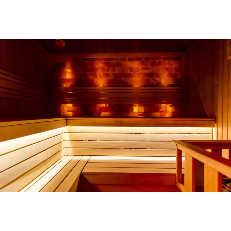 Himalájska soľ v saune nielen originálne vyzerá, ale má aj mnoho pozitívnych vlastností pre naše zdravie. Pomáha pri upchatých dutinách, čistí škvaru, reguluje krvný tlak, znižuje príznaky alergie a astmy, pozdvihuje náladu a dodáva energiu. Himalájska soľ zlepšuje kvalitu vzduchu v interiéri, neutralizuje elektromagnetické žiarenie, znižuje statickú elektrinu vo vzduchu.