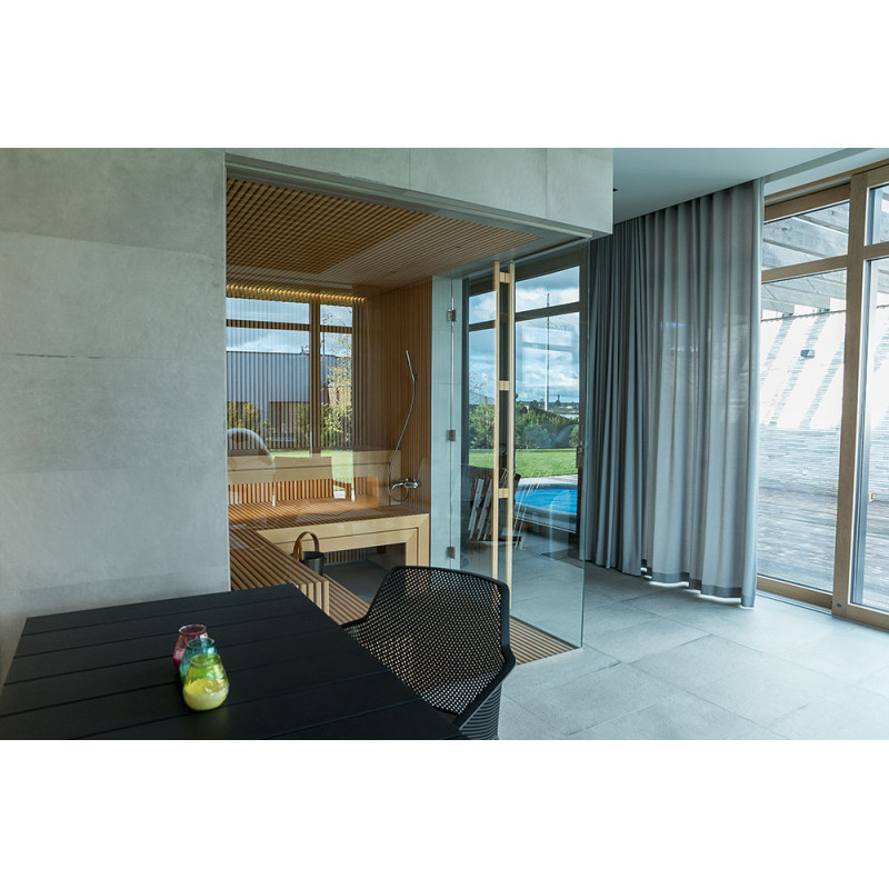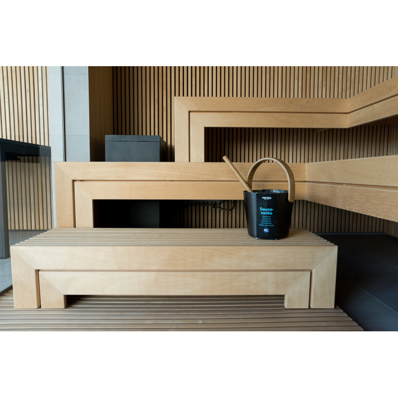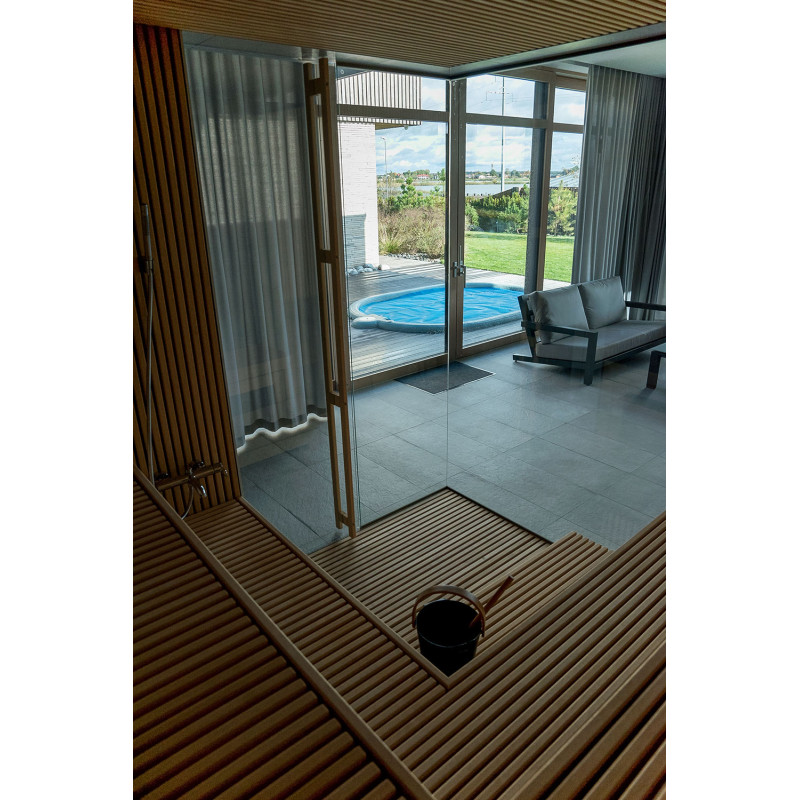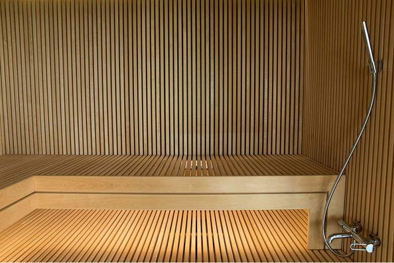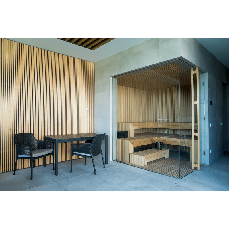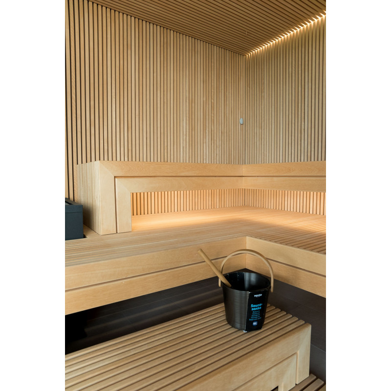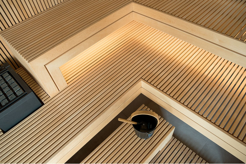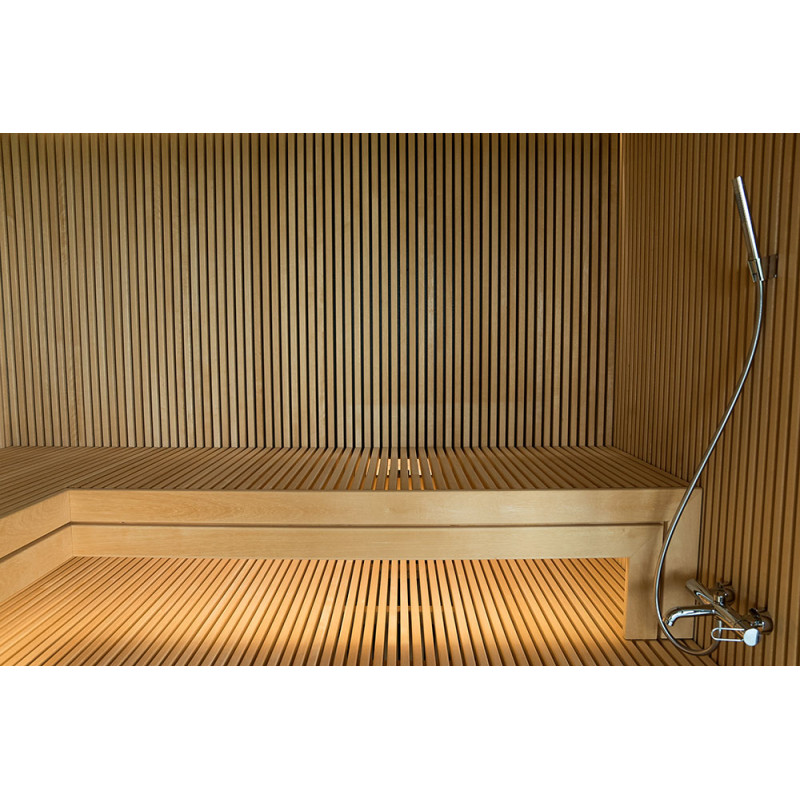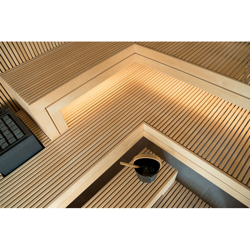 Zvolené veľmi svetlé drevo je abachi. Mäkké a nízke teplo. Táto pozitívna vlastnosť vám umožní vychutnať si potešenie zo sauny v pohodlí. Osvetlenie z optických vlákien zvýrazňuje štruktúru dreva. Osvetlenie vybavené pod ležadlami a stropom sa vinie horizontálne cez celú stenu a pohodlne osvetľuje prelamované drevené pásy.
