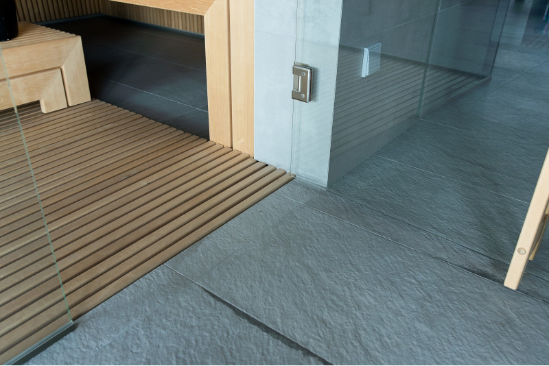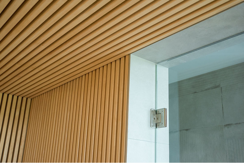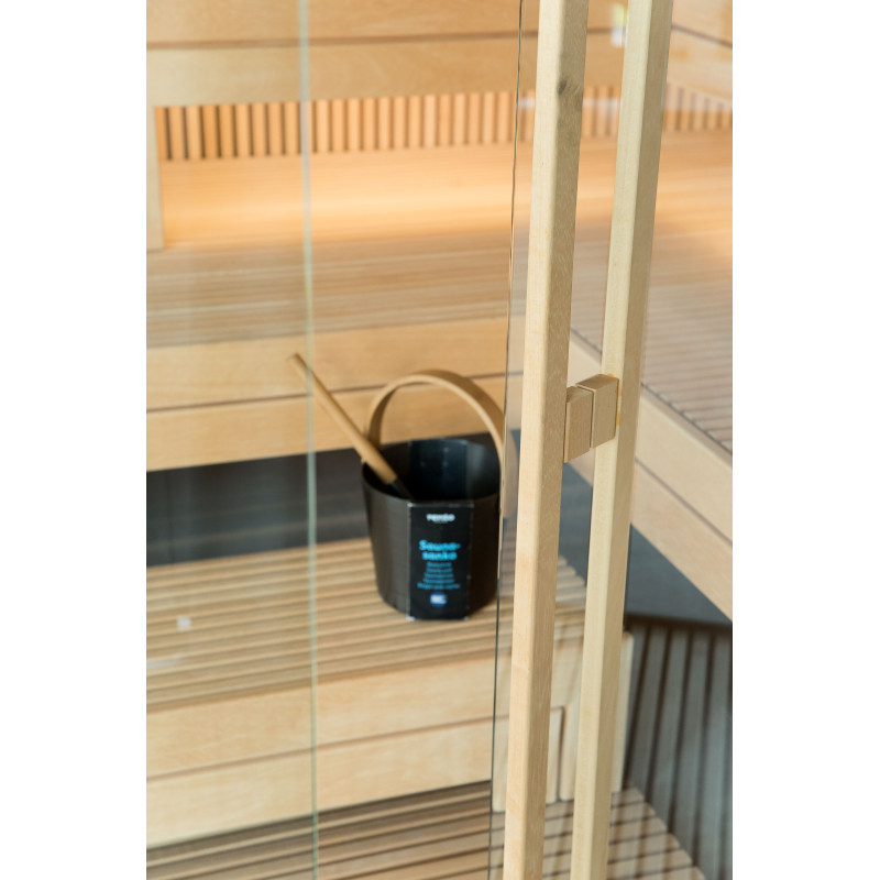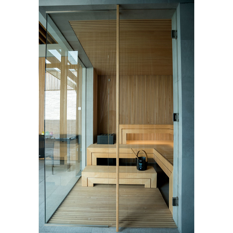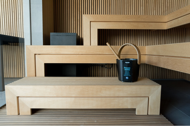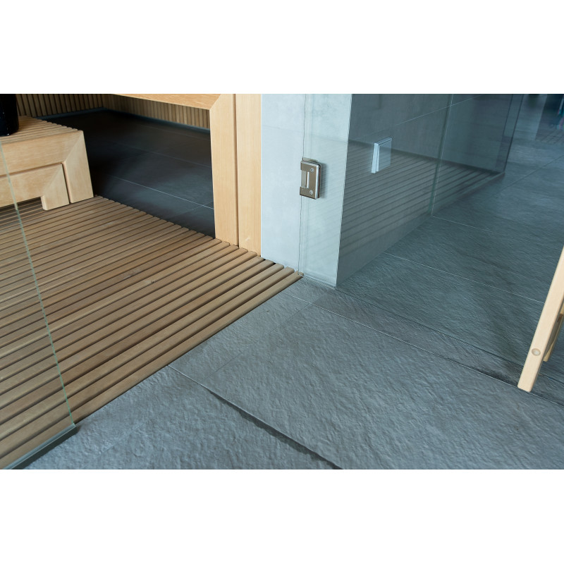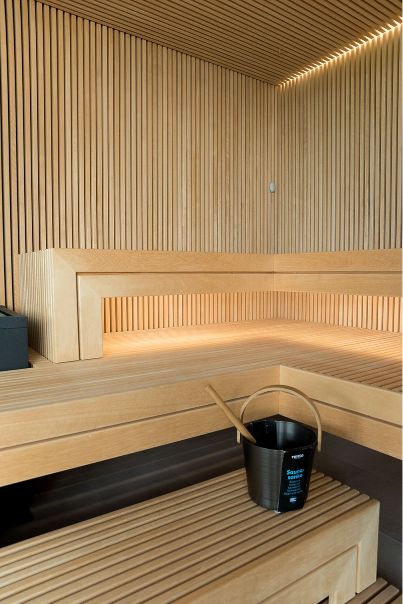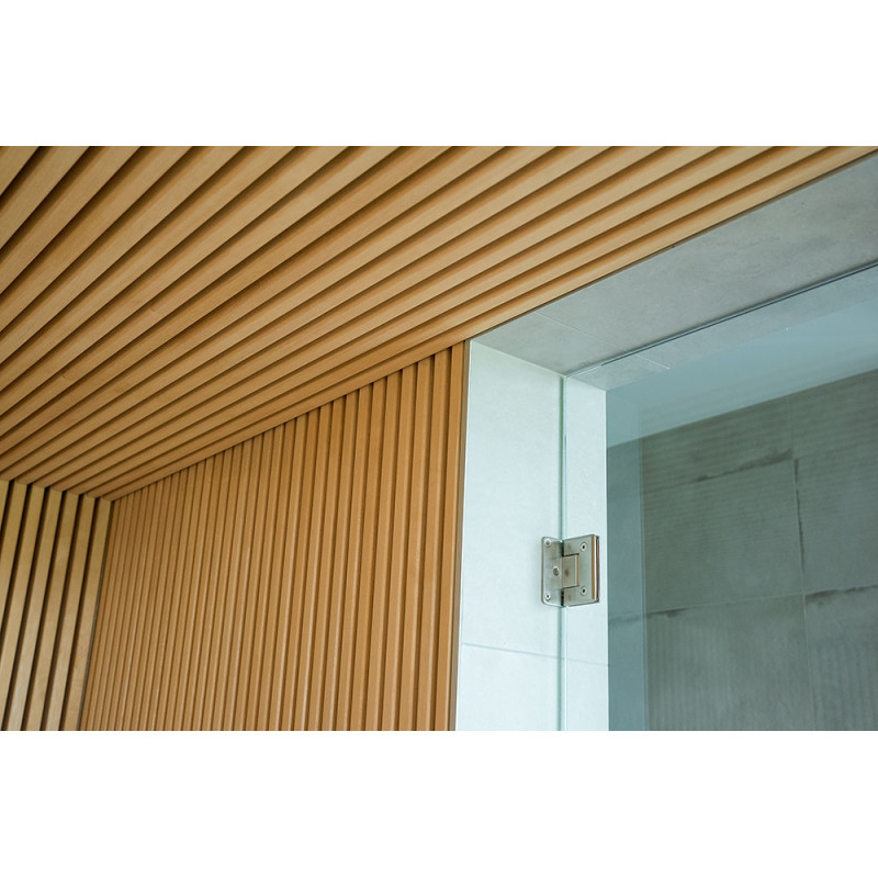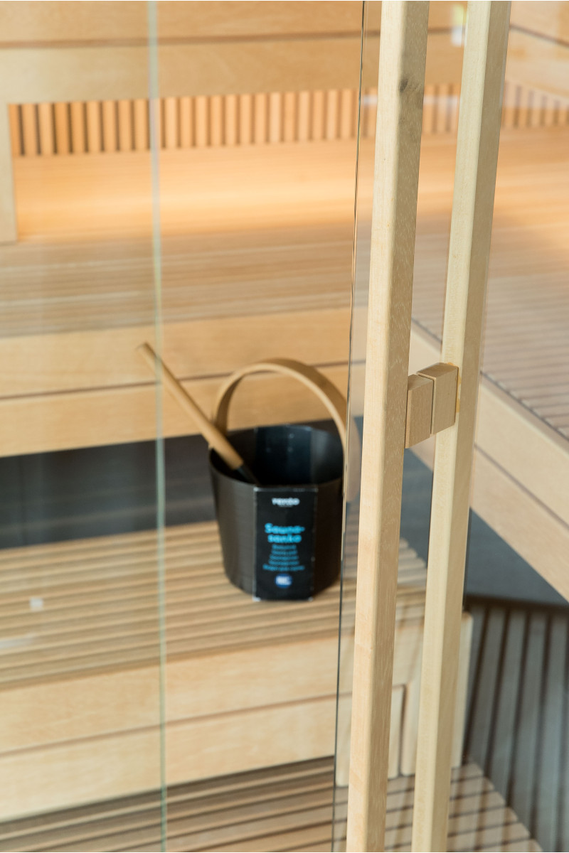 Zvolené veľmi svetlé drevo je abachi. Mäkké a nízke teplo. Táto pozitívna vlastnosť vám umožní vychutnať si potešenie zo sauny v pohodlí. Osvetlenie z optických vlákien zvýrazňuje štruktúru dreva. Osvetlenie vybavené pod ležadlami a stropom sa vinie horizontálne cez celú stenu a pohodlne osvetľuje prelamované drevené pásy.