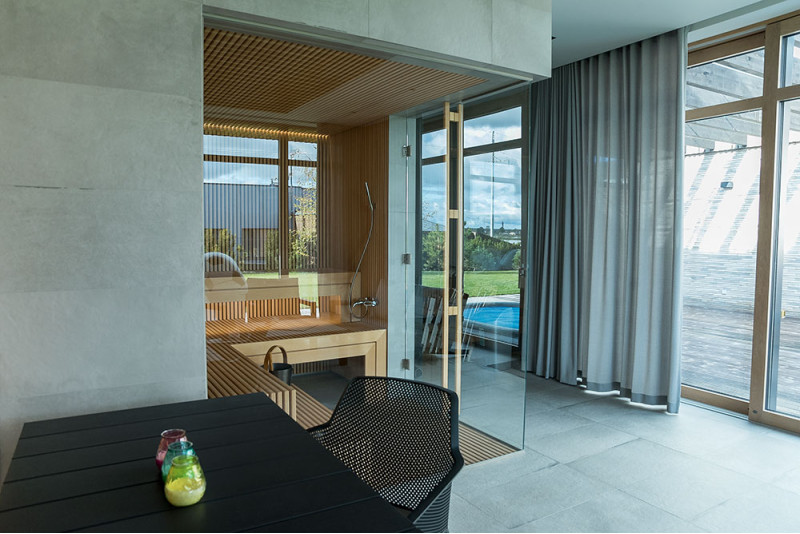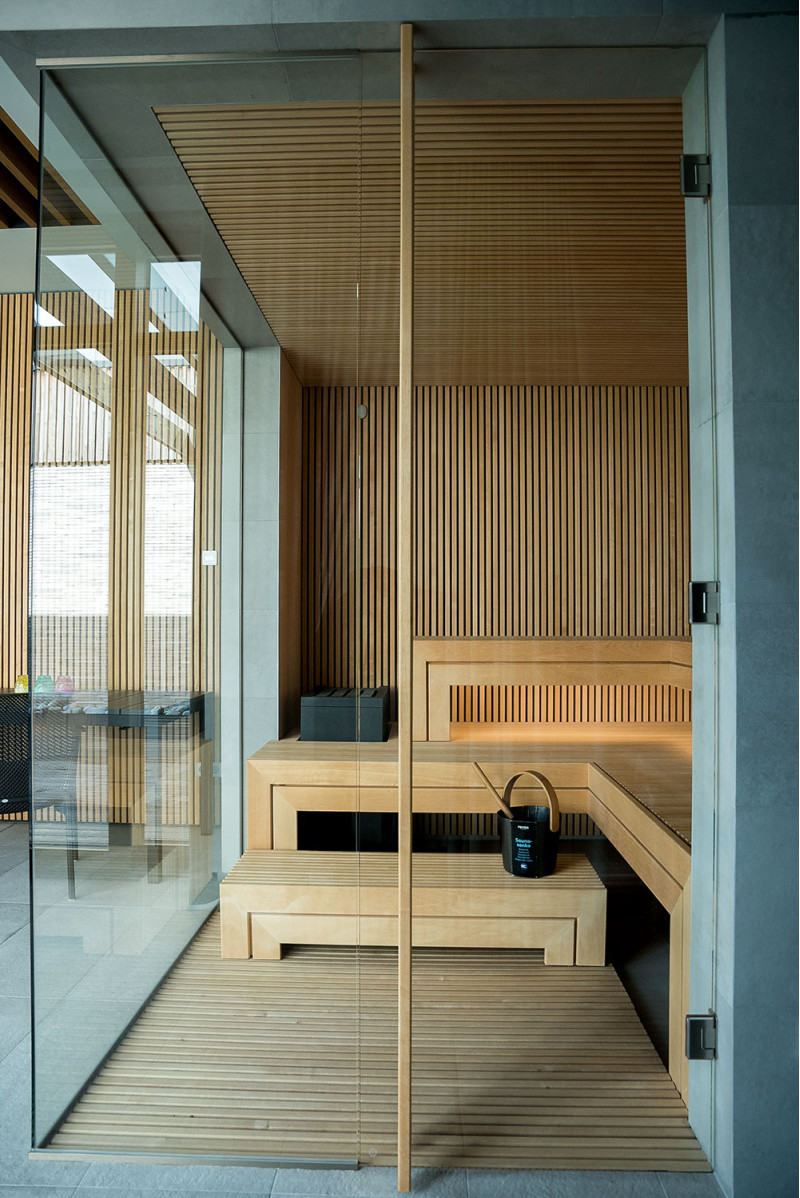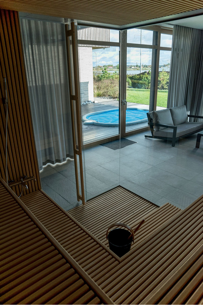 Exkluzívny dizajn tejto sauny je vytvorený zdobením prelamovanými drevenými bruselmi. V saune boli použité aj opakujúce sa motívy dreva. Vznikol čistý a harmonický priestor, nie je členený presklenou vitrínou sauny, ale naopak - rozširuje a otvára výhľad do nádhernej prírody.