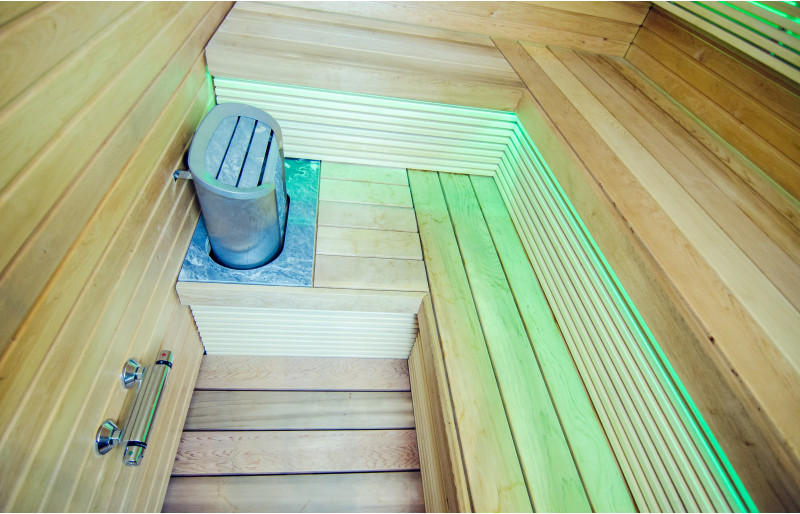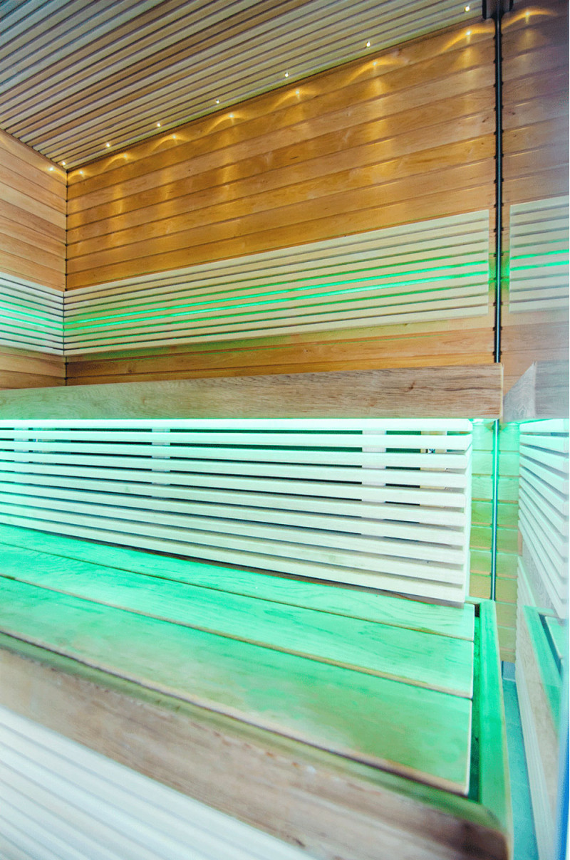 Lavičky a podlahové rošty - neštandardné, široké dosky z cédrového dreva. Céder je mimoriadne dekoratívne drevo vďaka svojej krásnej štruktúre a príjemnej farbe. Cédrový obklad je tiež odolný voči vysokým teplotám, málo absorbuje teplo, takže na takýchto lavičkách je príjemné sedieť alebo ležať.