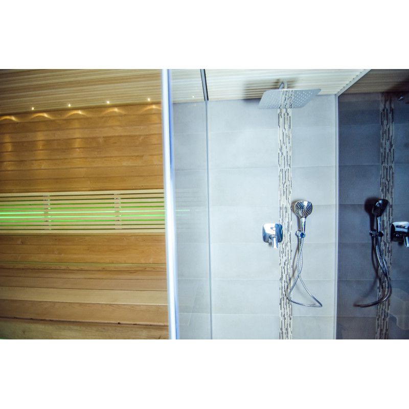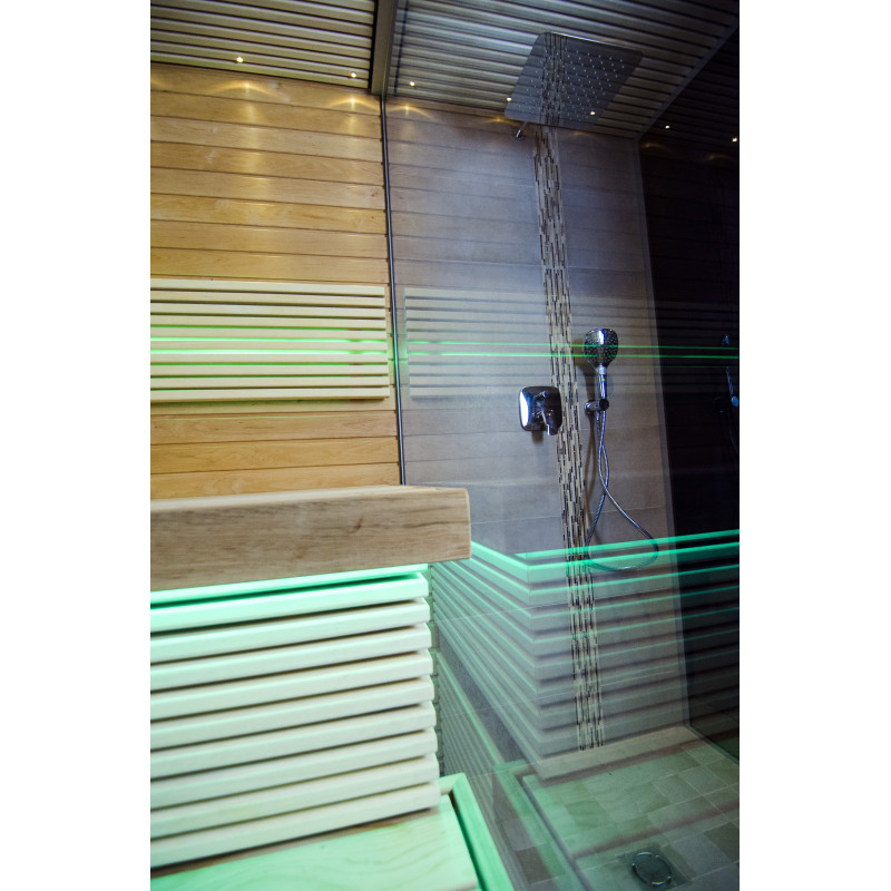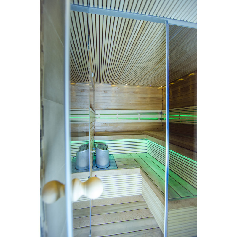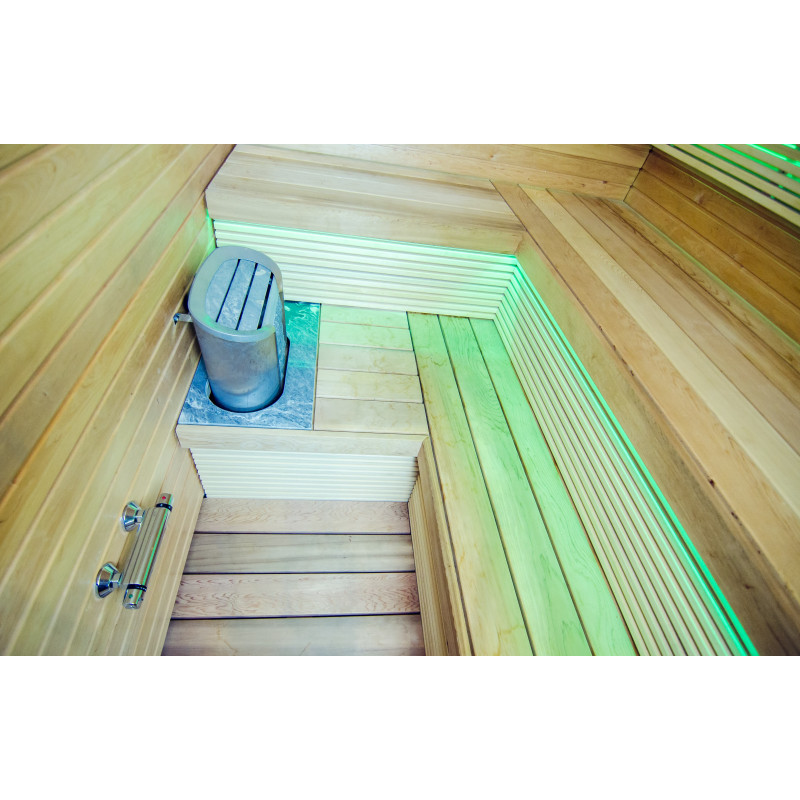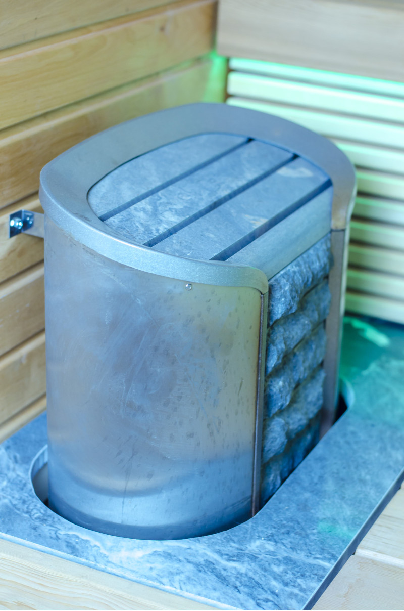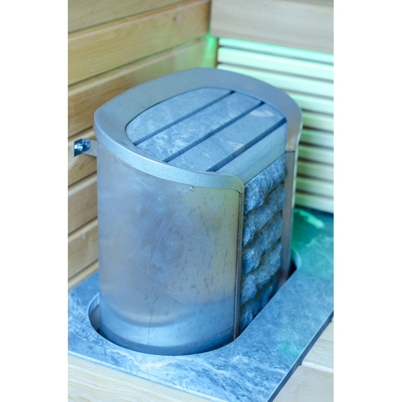 Ochranný okraj ohrievača je žulový kameň. Z parného generátora parnej sauny je do ohrievača zavedené parné potrubie, ktoré umožňuje dosiahnuť oveľa vyššiu vlhkosť v saune. To všetko je spojené do jedného spoločného riadiaceho systému. Je to skvelá voľba, ak nemáte podmienky na inštaláciu parnej miestnosti a sauny.