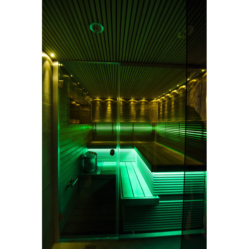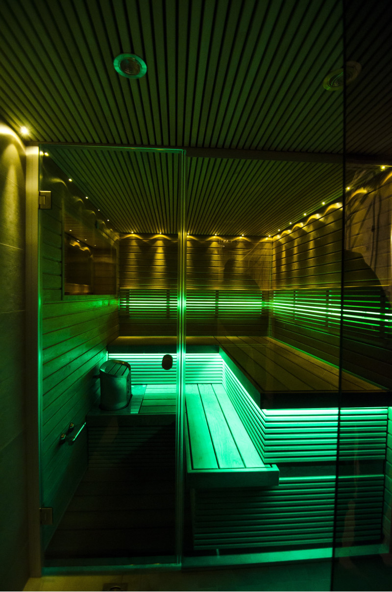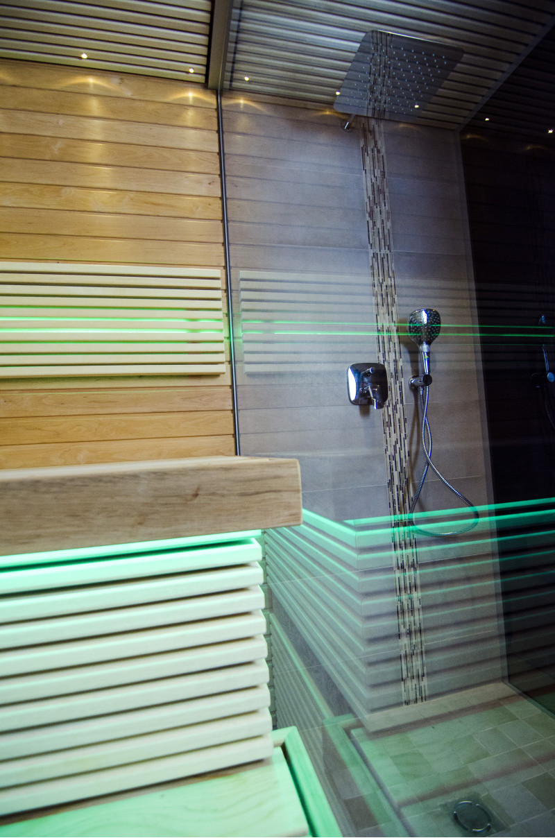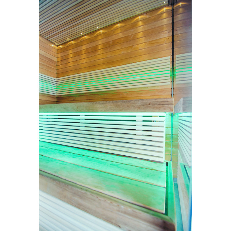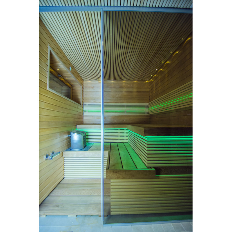 Ochranný okraj ohrievača je žulový kameň. Z parného generátora parnej sauny je do ohrievača zavedené parné potrubie, ktoré umožňuje dosiahnuť oveľa vyššiu vlhkosť v saune. To všetko je spojené do jedného spoločného riadiaceho systému. Je to skvelá voľba, ak nemáte podmienky na inštaláciu parnej miestnosti a sauny.