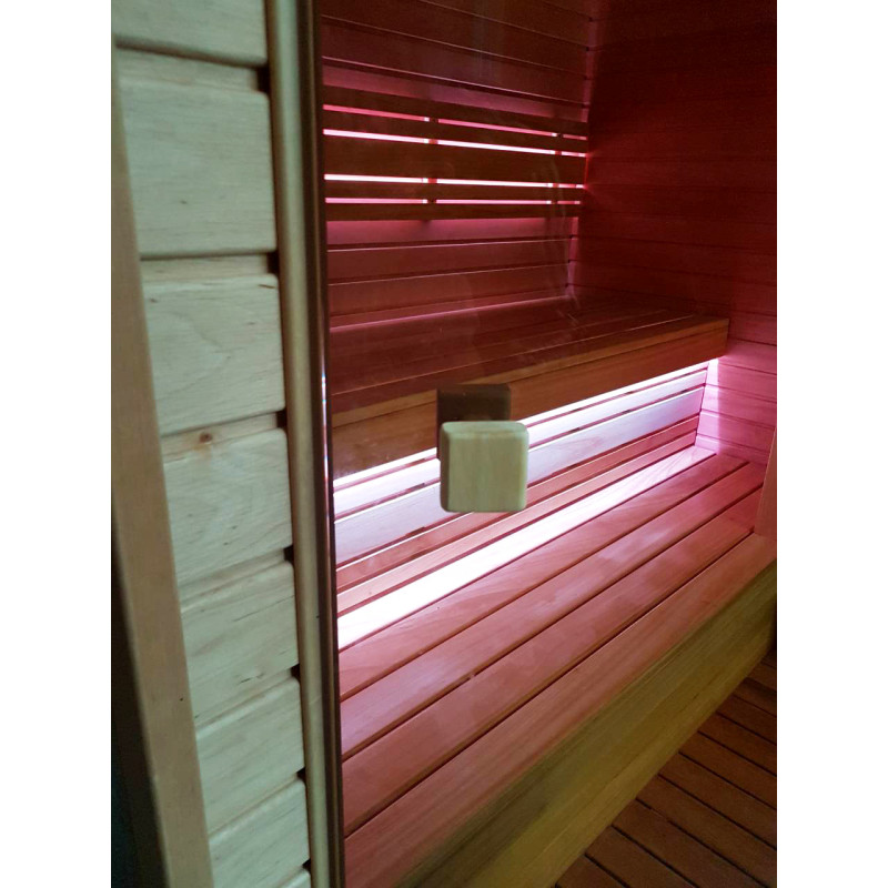 Osvetlenie sauny je veľmi dôležitým detailom, ktorý v saune dodáva polorelaxačný efekt. Pod lavicami a operadlami sa nachádza LED RGB farebné osvetlenie, ktorého farbu si môžete kedykoľvek zmeniť. Sauna je tiež vybavená optickým systémom bieleho osvetlenia "Moon".