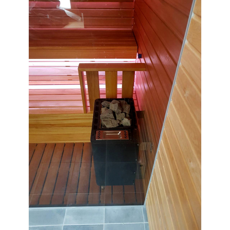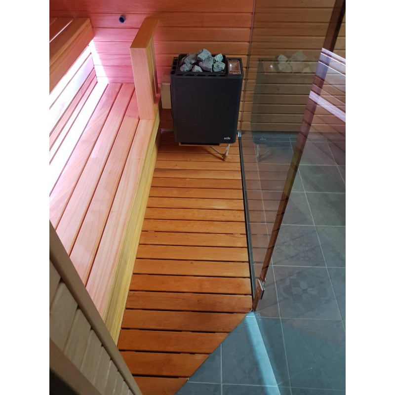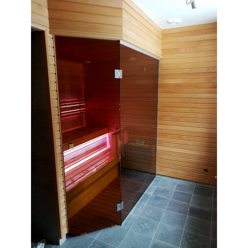Namiesto tradičných dverí a stien má táto kombinovaná sauna moderne vyzerajúcu vitrínu z tvrdeného tónovaného skla. Takáto vitrína je moderná a poskytuje pocit priestoru.