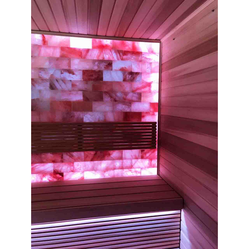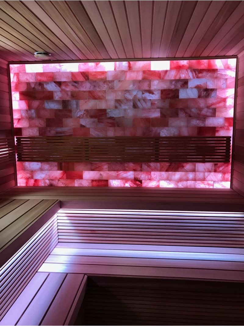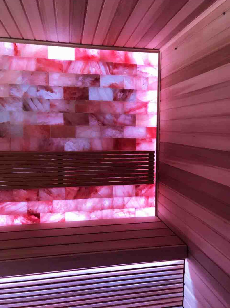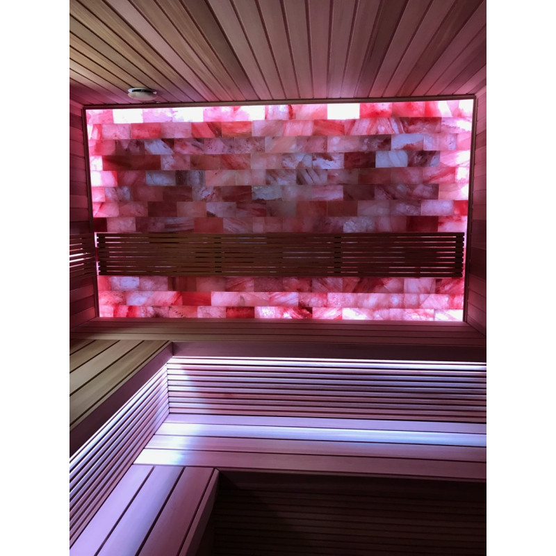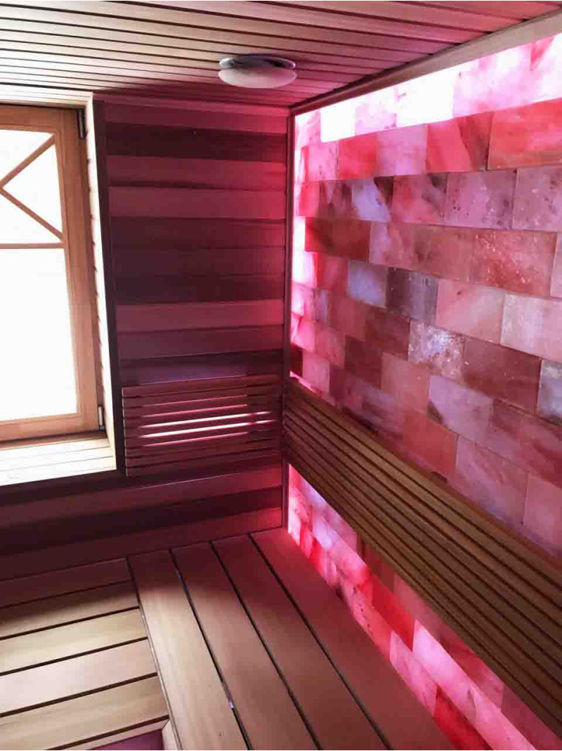 Kvalitu vzduchu a pocity zo sauny výrazne zvyšuje veľká stena himalájskych solí. Emisné negatívne ióny zlepšujú zdravie, pomáhajú prekonať mnohé choroby, ako sú: bronchiálna astma, ochorenia pľúc a priedušiek, postinfarkt, hypertenzia, gastrointestinálne vredy, zápal žalúdka, ochorenia štítnej žľazy, dermatitída, rôzne alergie, nervové choroby, pomáhajú prekonať stres. Výhody vykonávania procedúr v takejto saune sú dvojnásobné.