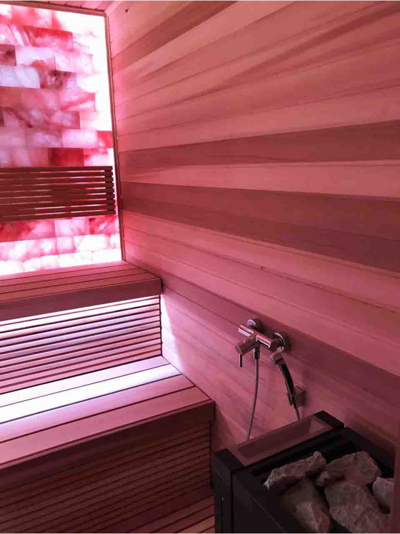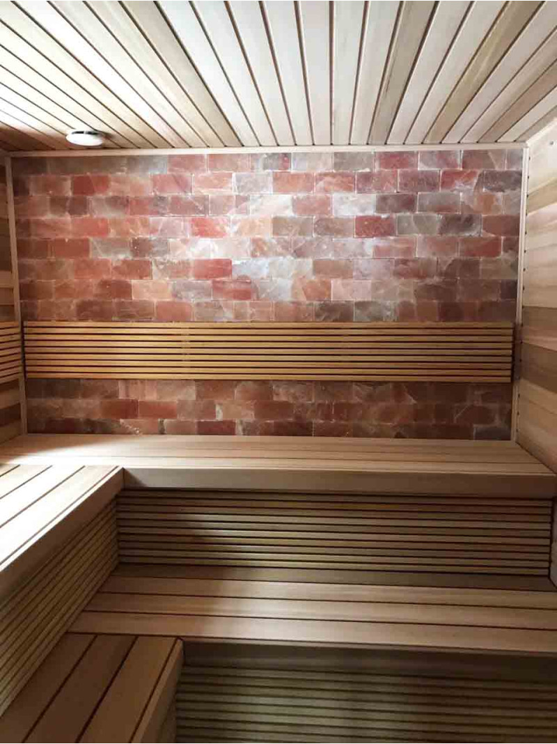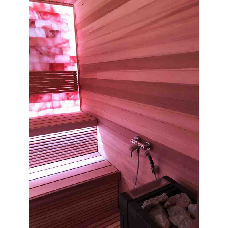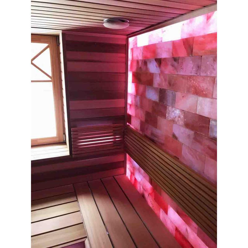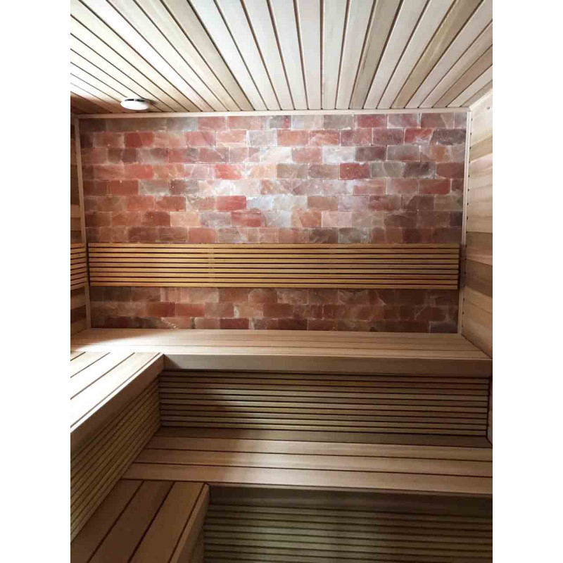 Kvalitu vzduchu a pocity zo sauny výrazne zvyšuje veľká stena himalájskych solí. Emisné negatívne ióny zlepšujú zdravie, pomáhajú prekonať mnohé choroby, ako sú: bronchiálna astma, ochorenia pľúc a priedušiek, postinfarkt, hypertenzia, gastrointestinálne vredy, zápal žalúdka, ochorenia štítnej žľazy, dermatitída, rôzne alergie, nervové choroby, pomáhajú prekonať stres. Výhody vykonávania procedúr v takejto saune sú dvojnásobné.