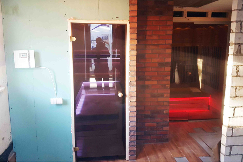 Osvetlenie sauny - LED "Saulė" - 12 žiaroviek v strope, odolné voči vlhkosti a teplote. Pod lavicami pre vytvorenie útulnej atmosféry - farebné RGB osvetlenie, ovládané bezdrôtovým meničom farieb.