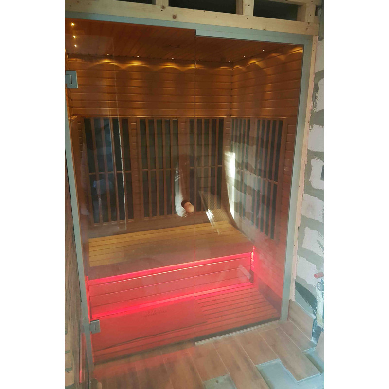 Vybavenie sauny: Infražiarič HARVIA CARBON s ochrannou mriežkou, ovládací panel Harvia Griffin Infra CG170I. Tento panel možno použiť na ovládanie prevádzkového času, teploty, osvetlenia a vetrania. Pomocou časovača môžete nastaviť, kedy má byť sauna pripravená. Chrómový digitálny ovládací panel je dokonale kompatibilný s ostatnými modernými saunovými zariadeniami.