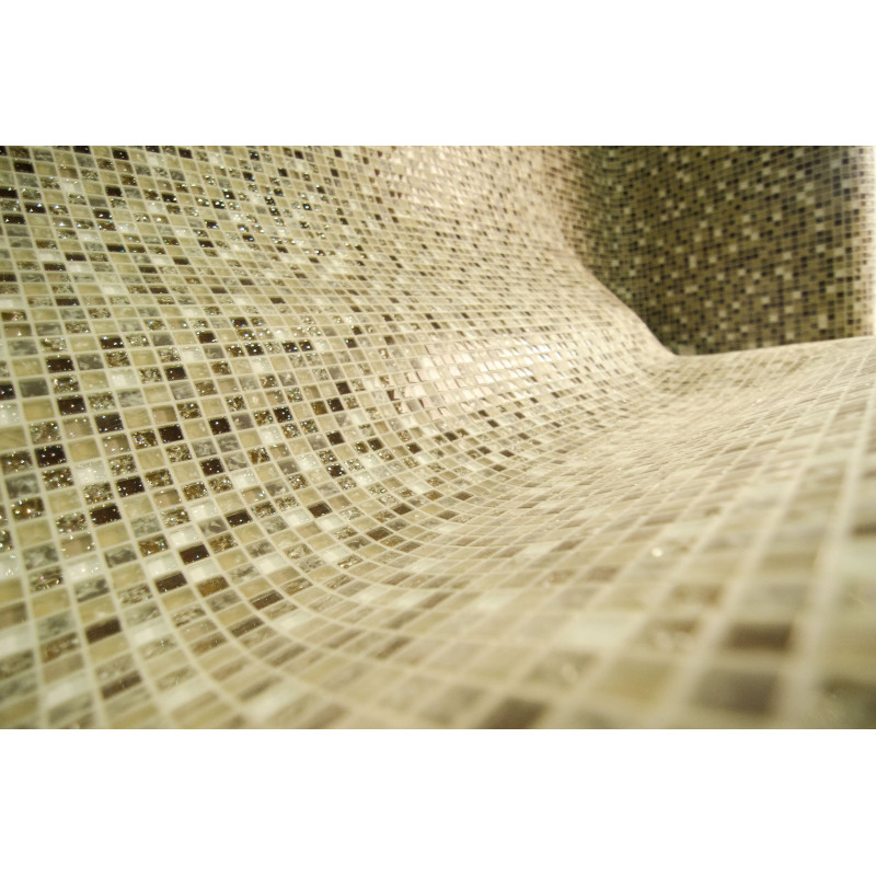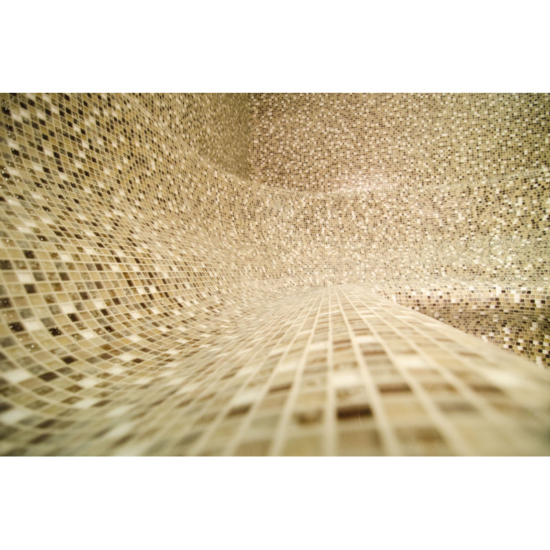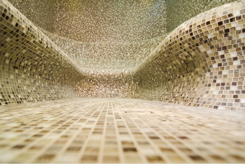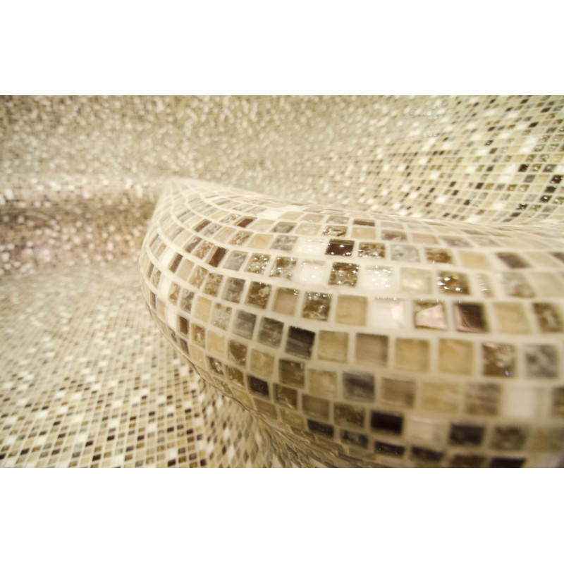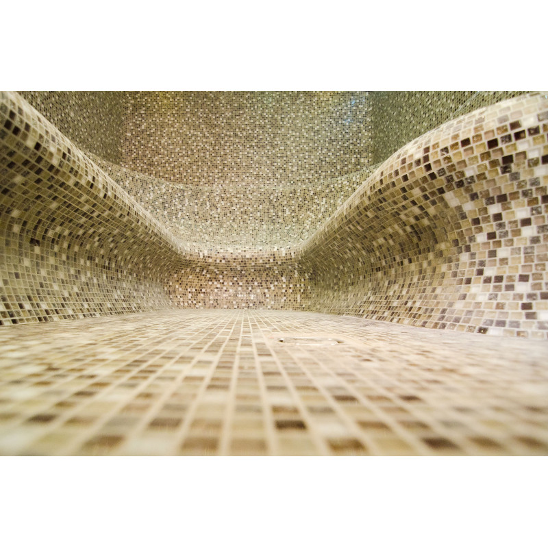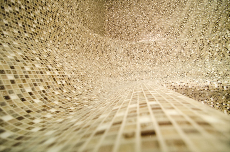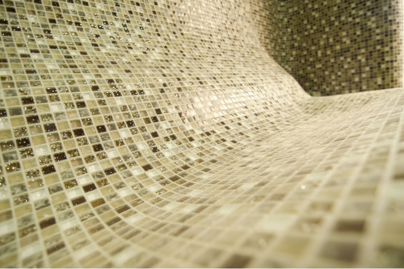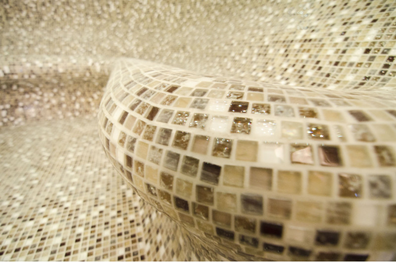 Povrchová úprava - steny, lavičky, podlahy zdobené drobnou mozaikou, dlažba v prírodnej farbe.