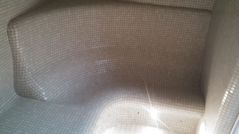 Konečná úprava - stropy sauny, steny a lehátka sú zdobené drvenou sklenenou mozaikou. Na podlahe je dlažba s dlhou životnosťou.