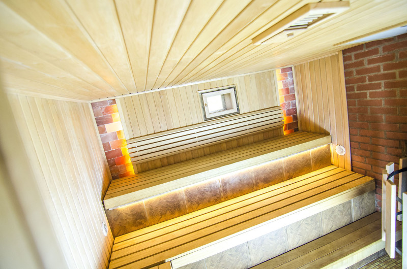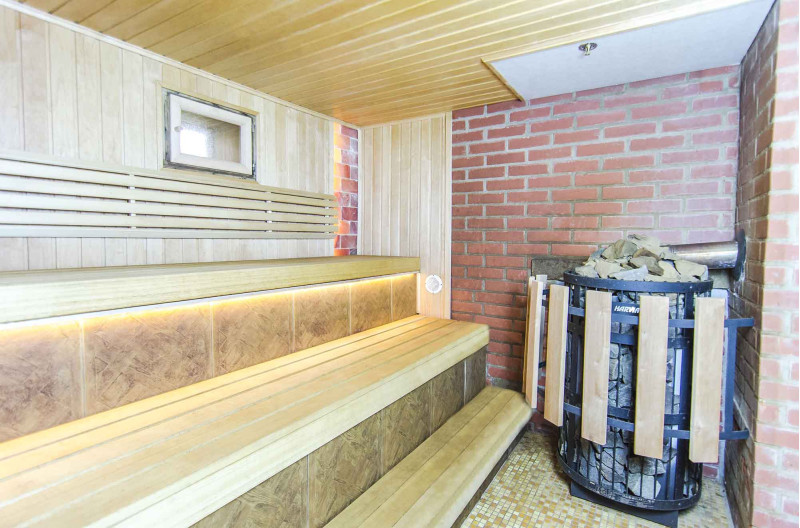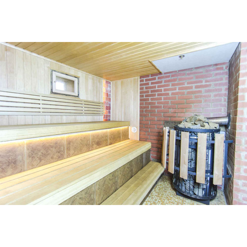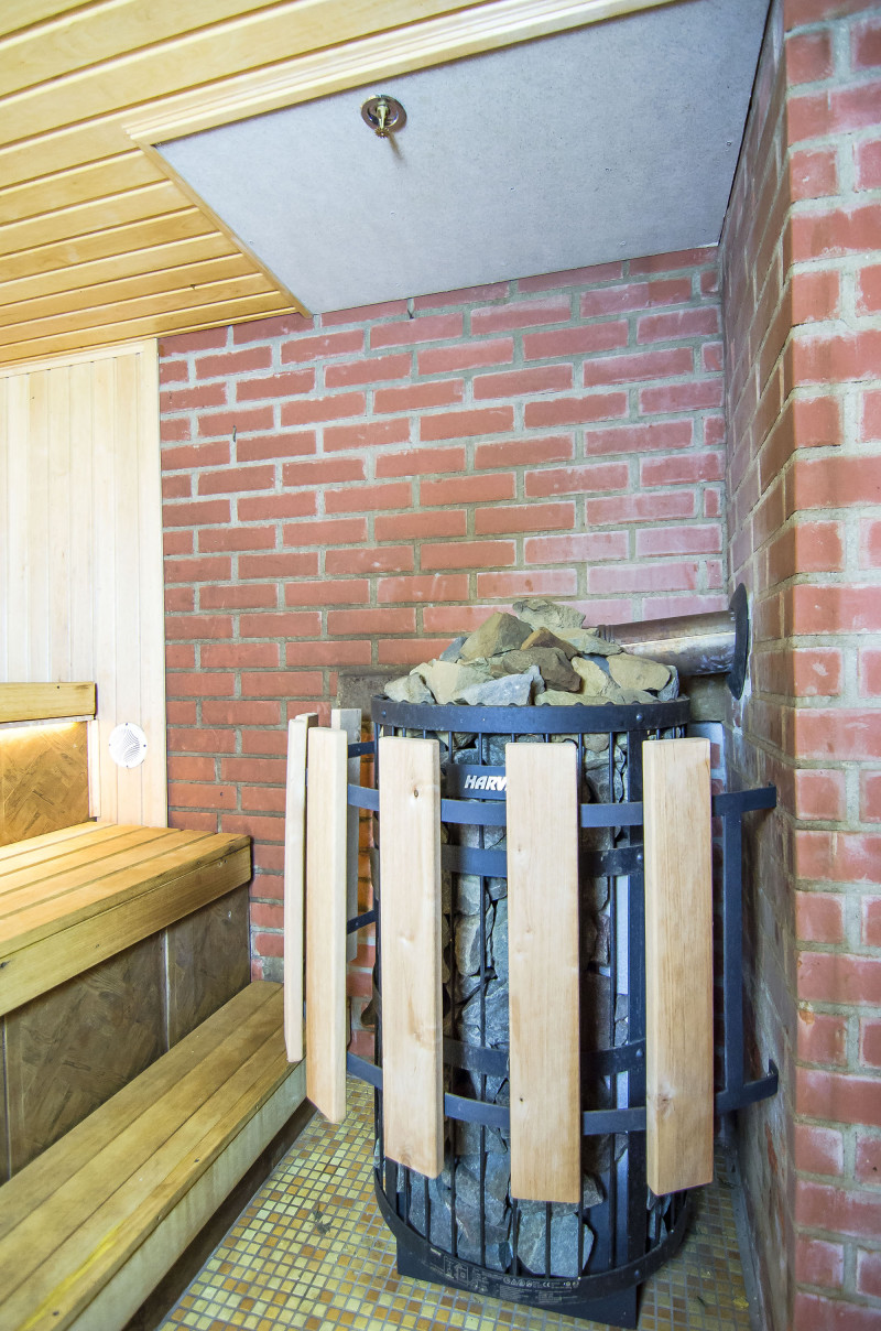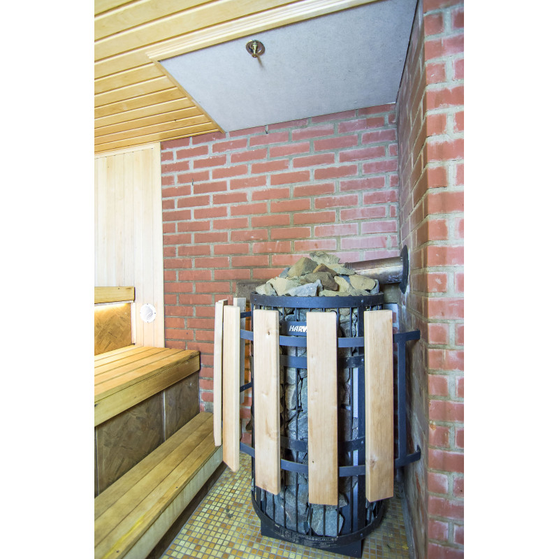 Vykurovacie zariadenie sauny bolo menené. Ručne vyrobený ohrievač sa premenil na drevo Harvia Legend 300 Duo s vonkajším ohniskom, ktoré pojme veľké množstvo kameňov, čo vám umožní vychutnať si teplo, ktoré vyžarujú, aj keď nie sú vysoké teploty. Strop je vybavený protipožiarnym systémom - doska Minerit Sauna, sprinkler. Okolo ohrievača je inštalovaná ochranná obruba z dreva a kovu.