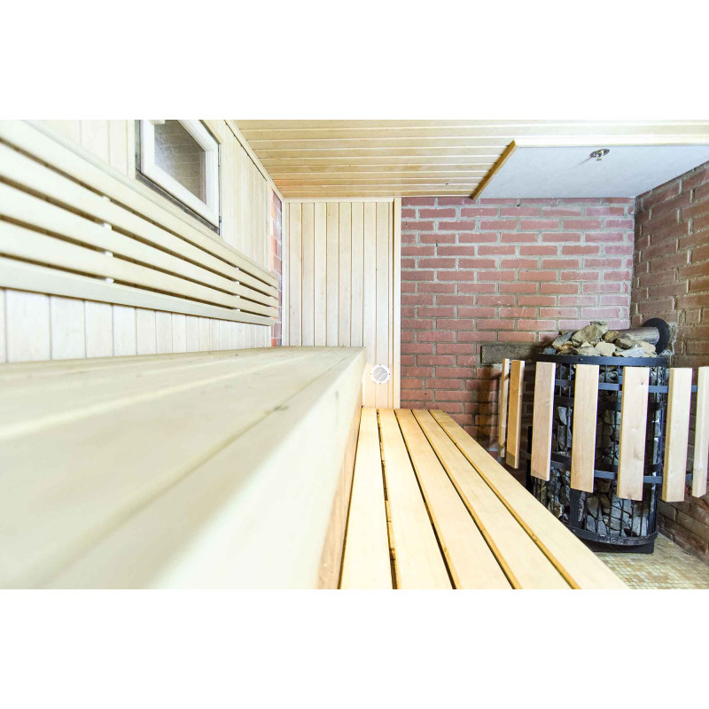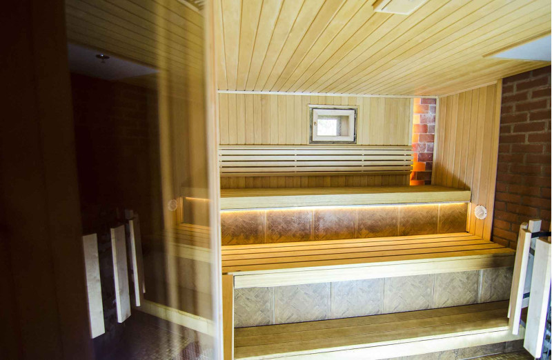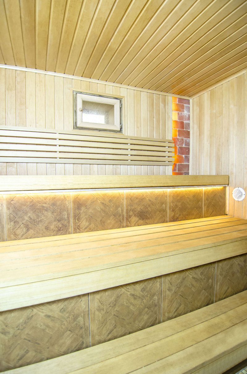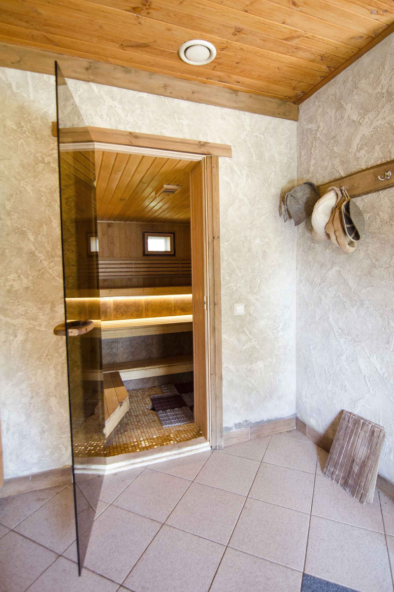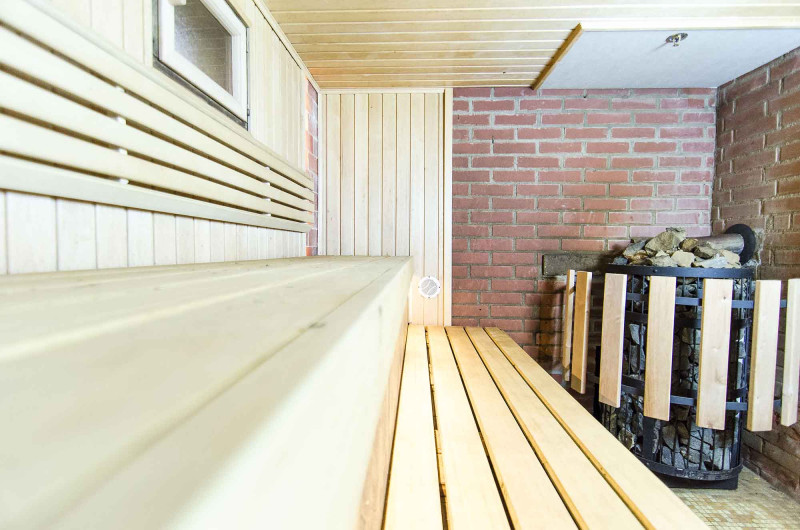 Vykurovacie zariadenie sauny bolo menené. Ručne vyrobený ohrievač sa premenil na drevo Harvia Legend 300 Duo s vonkajším ohniskom, ktoré pojme veľké množstvo kameňov, čo vám umožní vychutnať si teplo, ktoré vyžarujú, aj keď nie sú vysoké teploty. Strop je vybavený protipožiarnym systémom - doska Minerit Sauna, sprinkler. Okolo ohrievača je inštalovaná ochranná obruba z dreva a kovu.