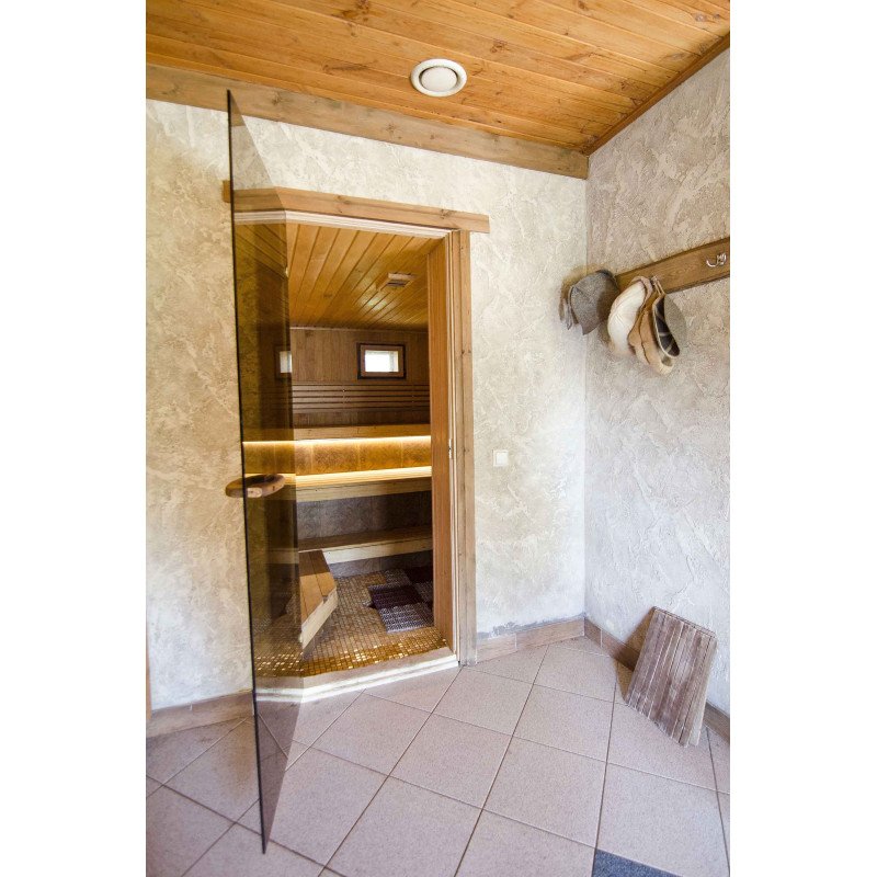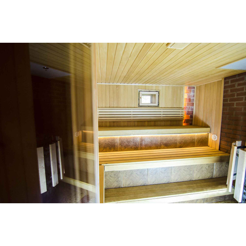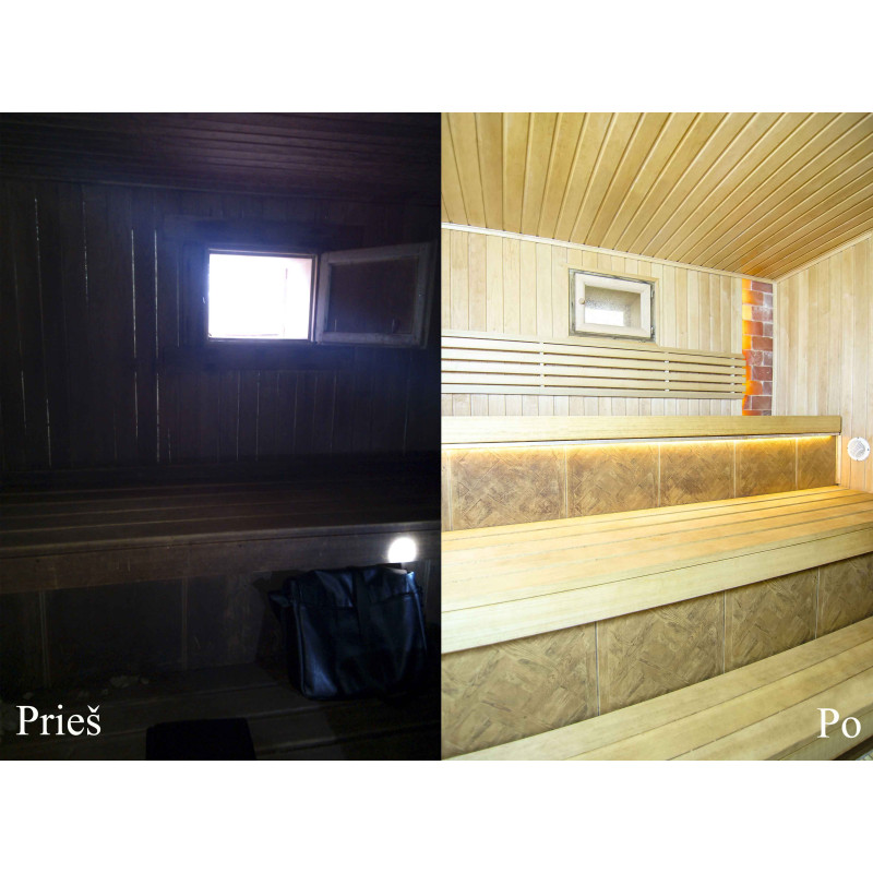 Vymenené okno - drevený rám, tvrdené sklo. Opotrebované dvere sauny boli nahradené novými - špeciálne určenými pre sauny s tvrdeným sklom a dreveným rámom. Toto sklo je tepelne spracované, 5x pevnejšie ako normálne. Rám je vyrobený zo špeciálne upraveného dreva, aby sa zabránilo deformácii rámu vplyvom kolísania teplôt.