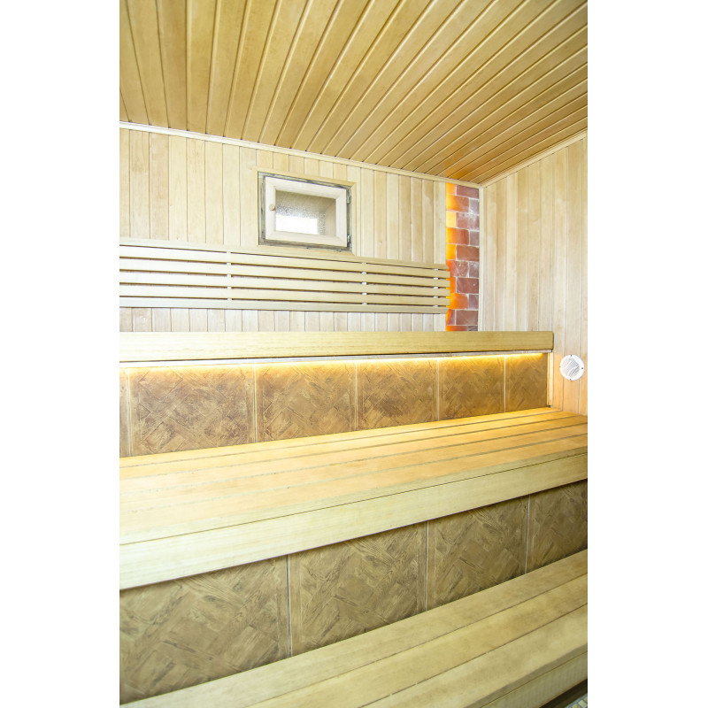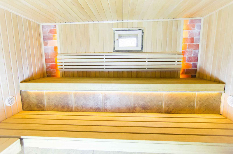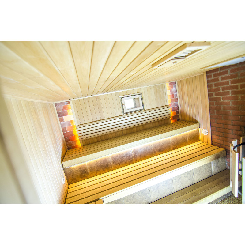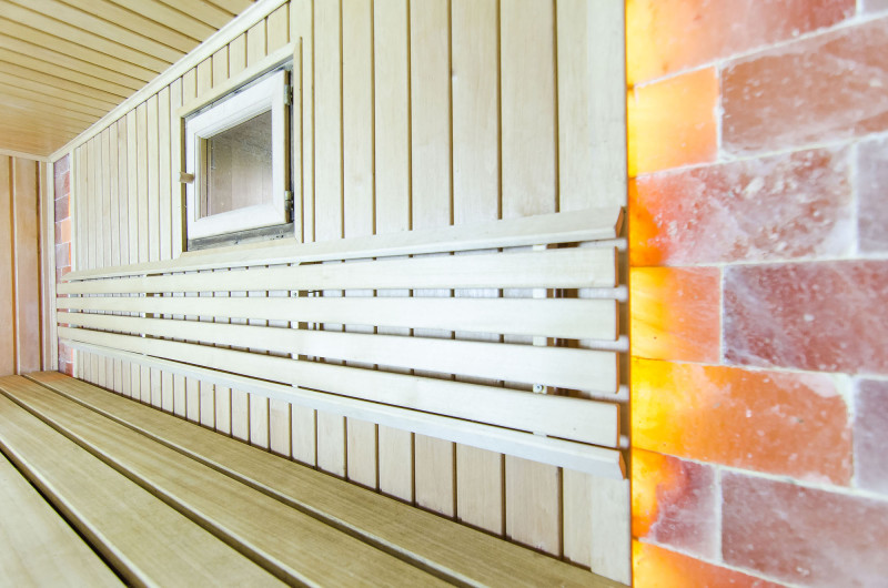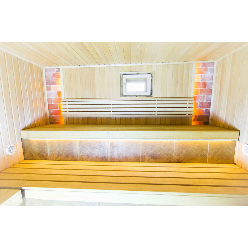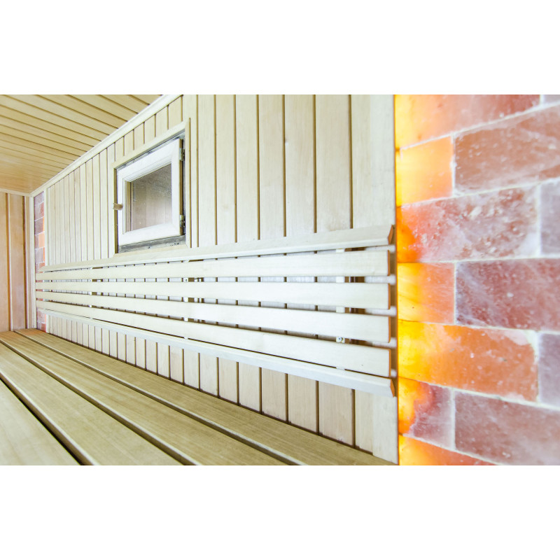 Na dekoráciu sauny bol zvolený vynikajúci dekoračný prvok - himalájske soľné bloky. Himalájska soľ nielen skvele vyzerá, ale aj zlepšuje kvalitu vzduchu v interiéri, znižuje prejavy alergií a astmy, zlepšuje náladu a dodáva energiu, neutralizuje elektromagnetické žiarenie, znižuje statickú elektrinu vo vzduchu. Zabudované LED osvetlenie za soľnými blokmi vytvára v saune ešte útulnejšie prostredie a zvýrazňuje vzhľad himalájskych soľných blokov.
