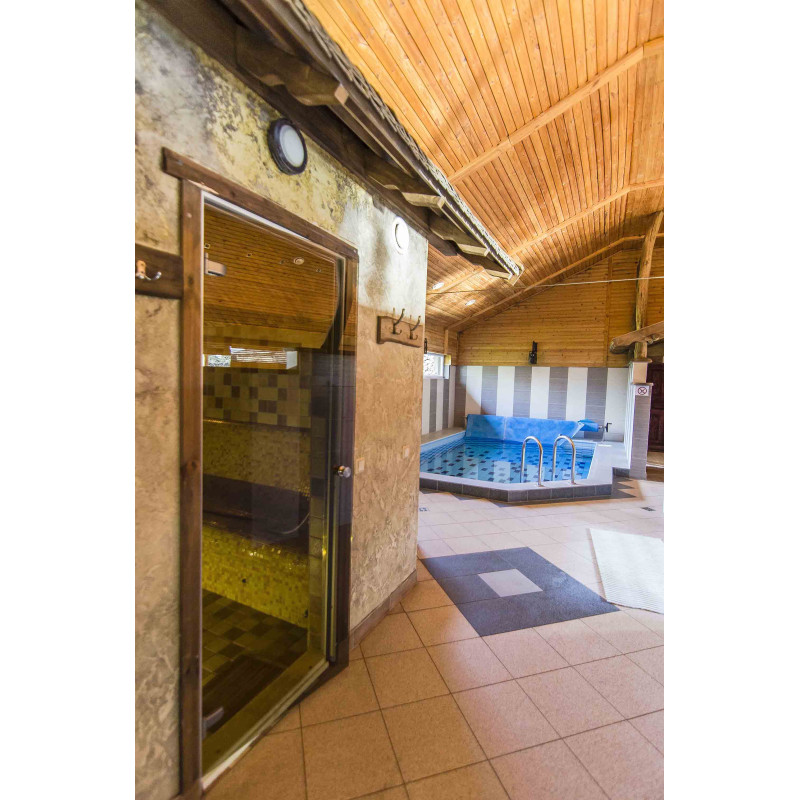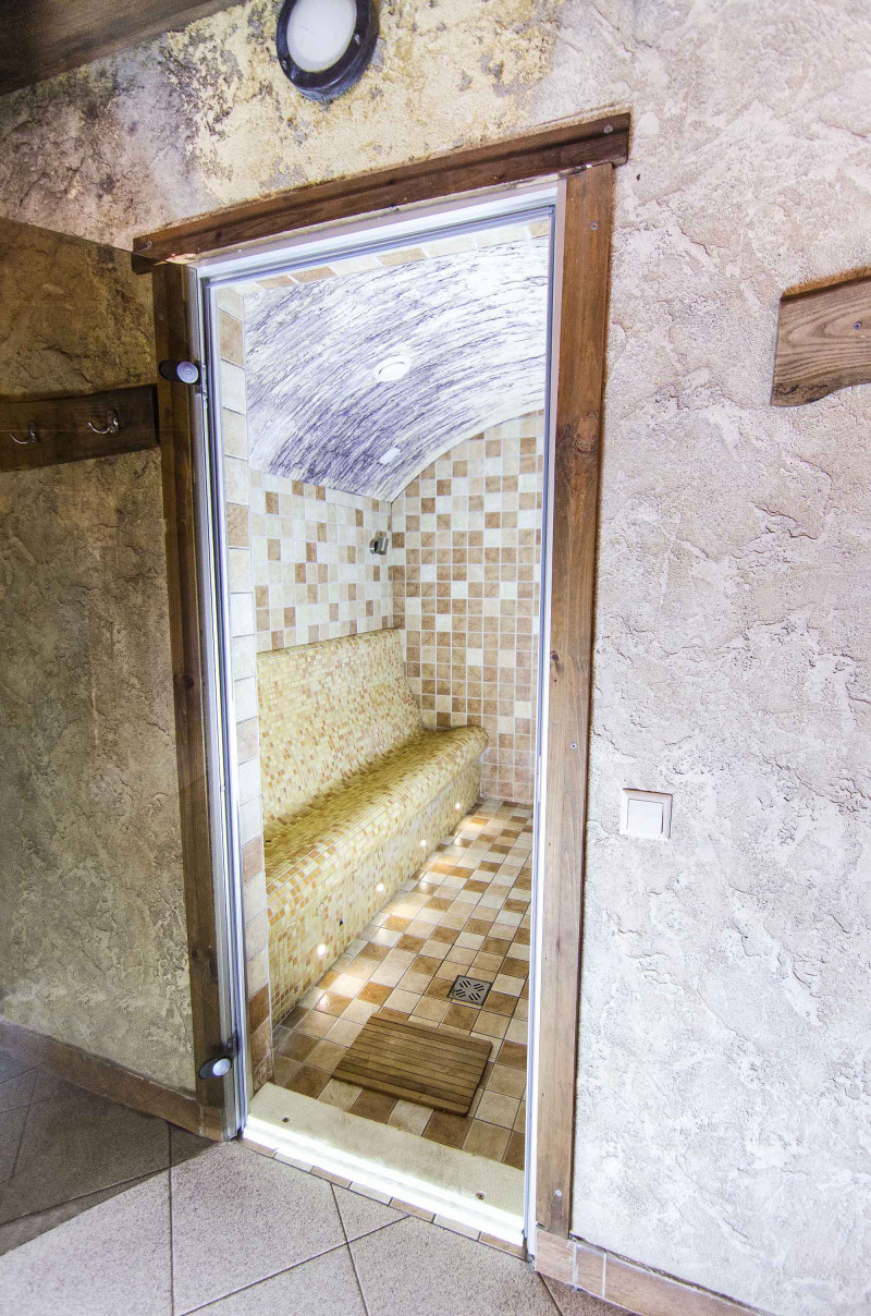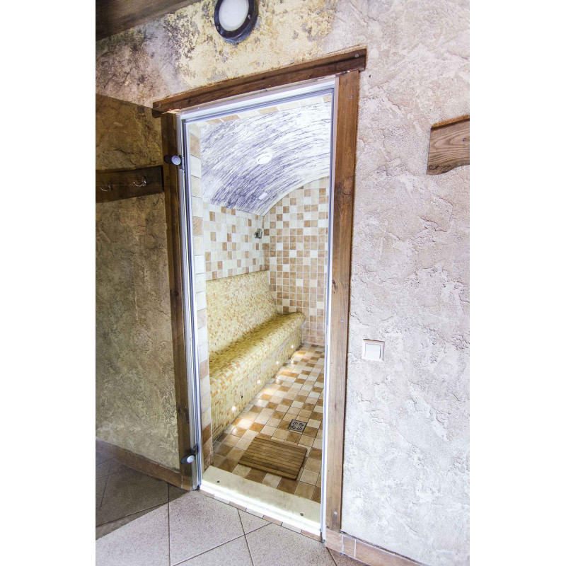 Dvere so starou drevenou zárubňou boli vymenené za vhodné do parnej sauny - s hliníkovým rámom, tónované, tvrdené sklo. Tento typ dverí a zárubní je odolný voči teplu a vlhkosti, teplotným výkyvom, nedeformuje sa.