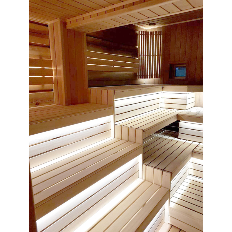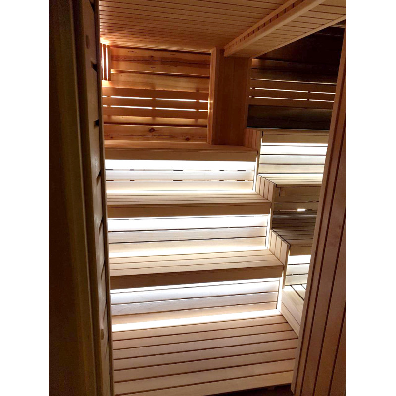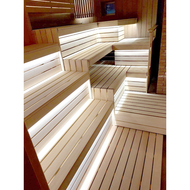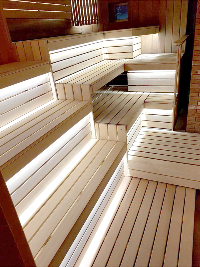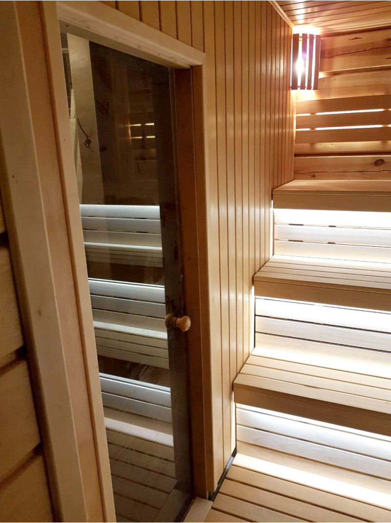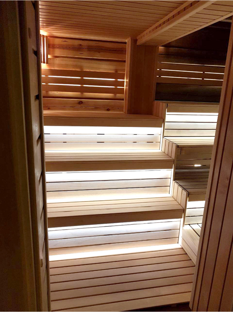 Teplé biele LED osvetlenie je inštalované pod lehátkami a dodáva saune pocit priestoru a útulnosti. Pre nástenné osvetlenie bolo zvolené svietidlo s ladiacim dreveným krytom.