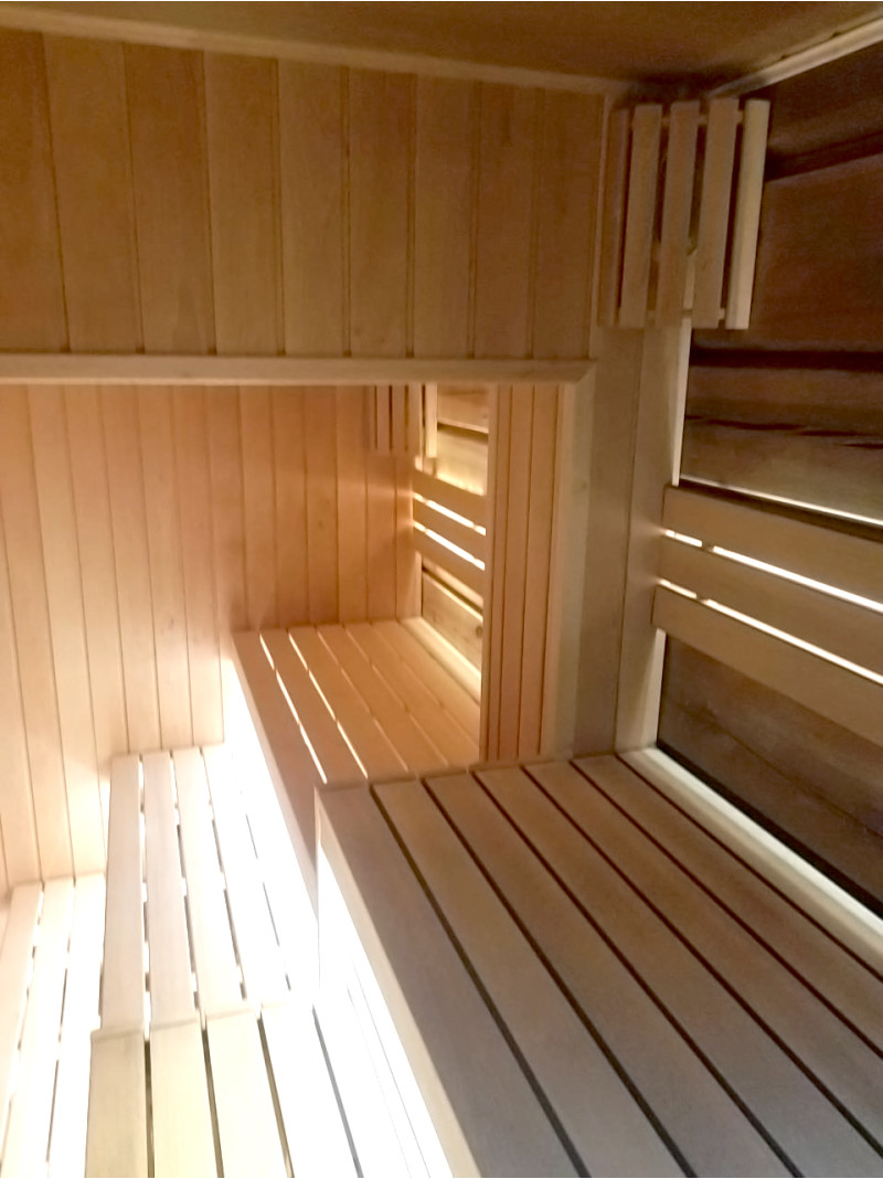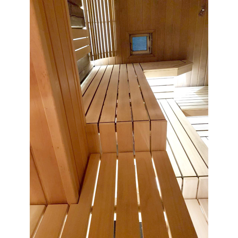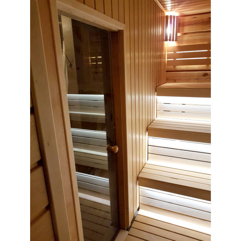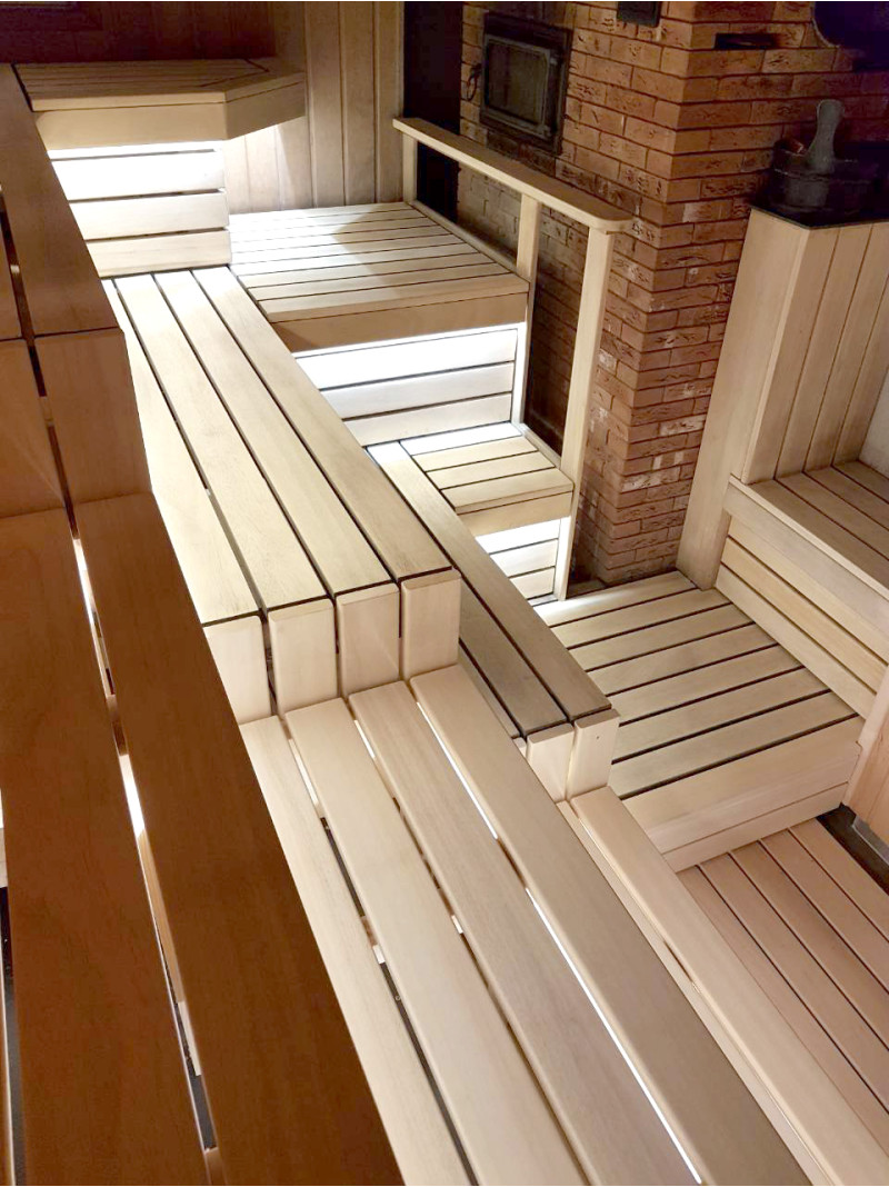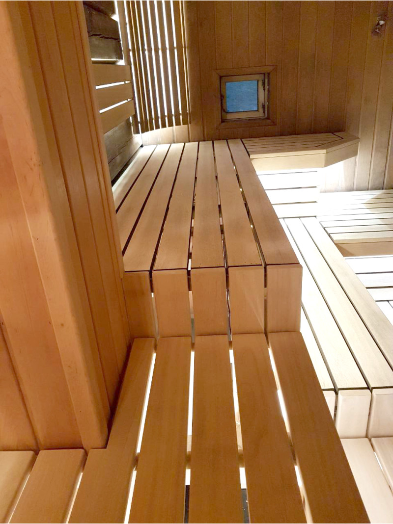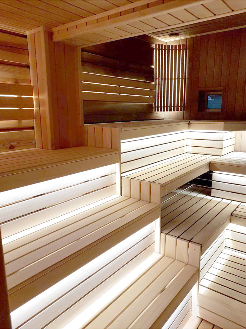 Teplé biele LED osvetlenie je inštalované pod lehátkami a dodáva saune pocit priestoru a útulnosti. Pre nástenné osvetlenie bolo zvolené svietidlo s ladiacim dreveným krytom.