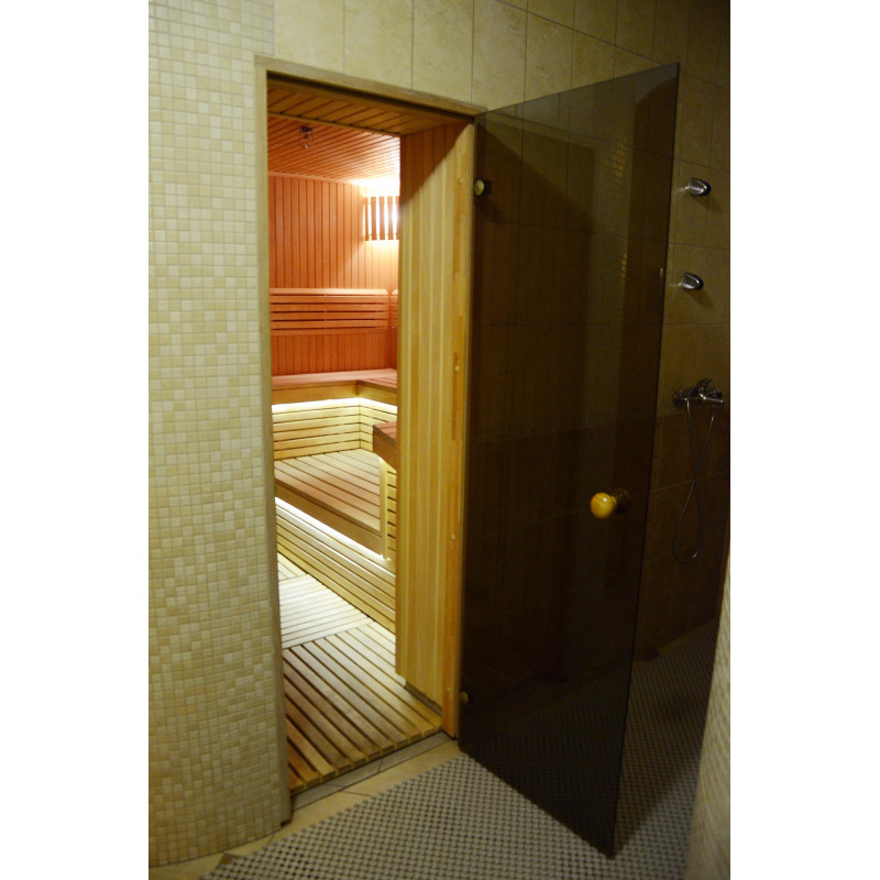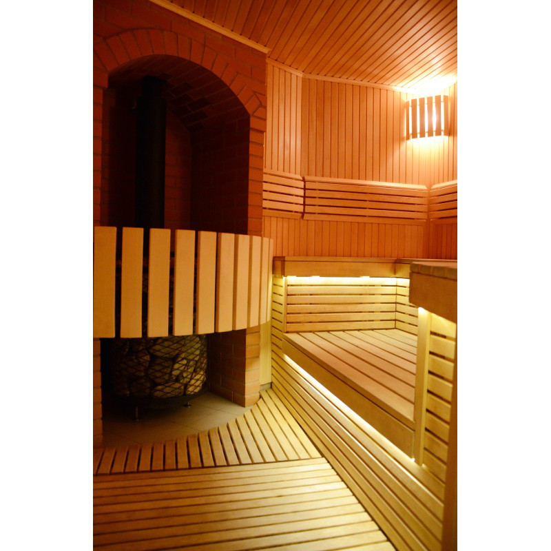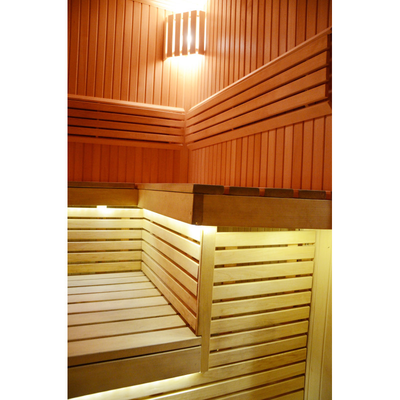 Steny a lavice sauny sú vyrobené z najkvalitnejšieho obkladu z lipového dreva, ktoré sa vyznačuje svojou svetlou, krásnou farbou a vyžaruje príjemnú prírodnú vôňu. Drevené sú aj kryty svietidiel, opierky a originálny ochranný plot okolo ohrievača.