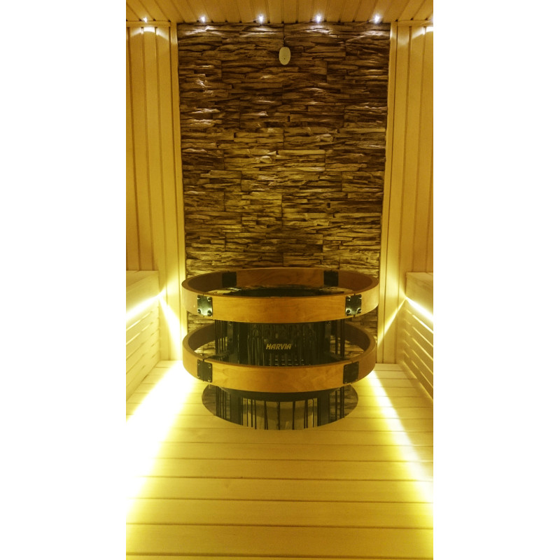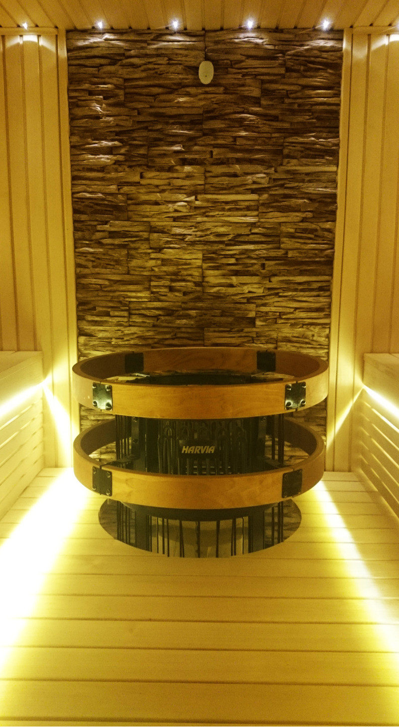 Ohrievač - Harvia Legend, ktorý dáva veľa pary. Naplnené veľkým množstvom kameňov olivín -diabázy. Ohrievač je ovládaný digitálnou konzolou Griffin, ktorá dokáže nastaviť teplotu na jeden stupeň presnosti.
