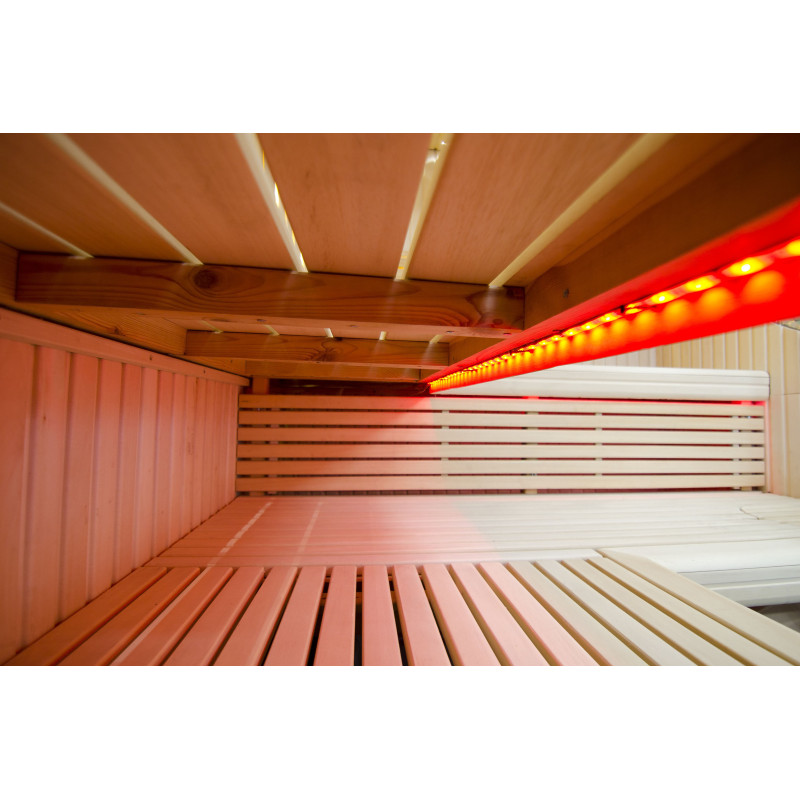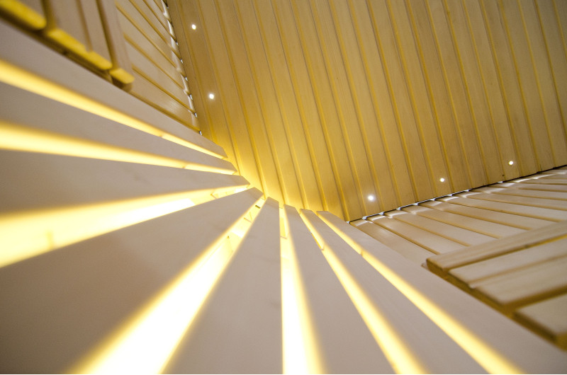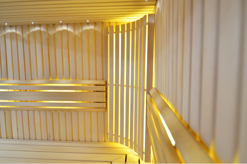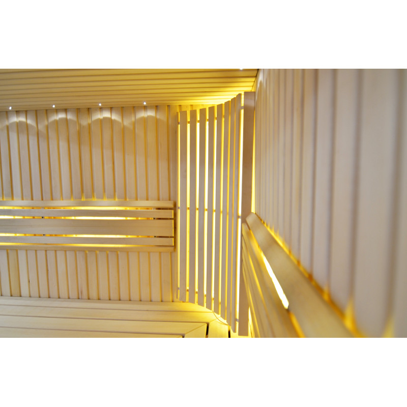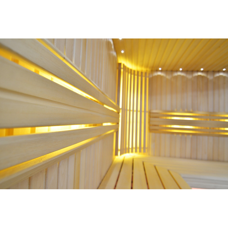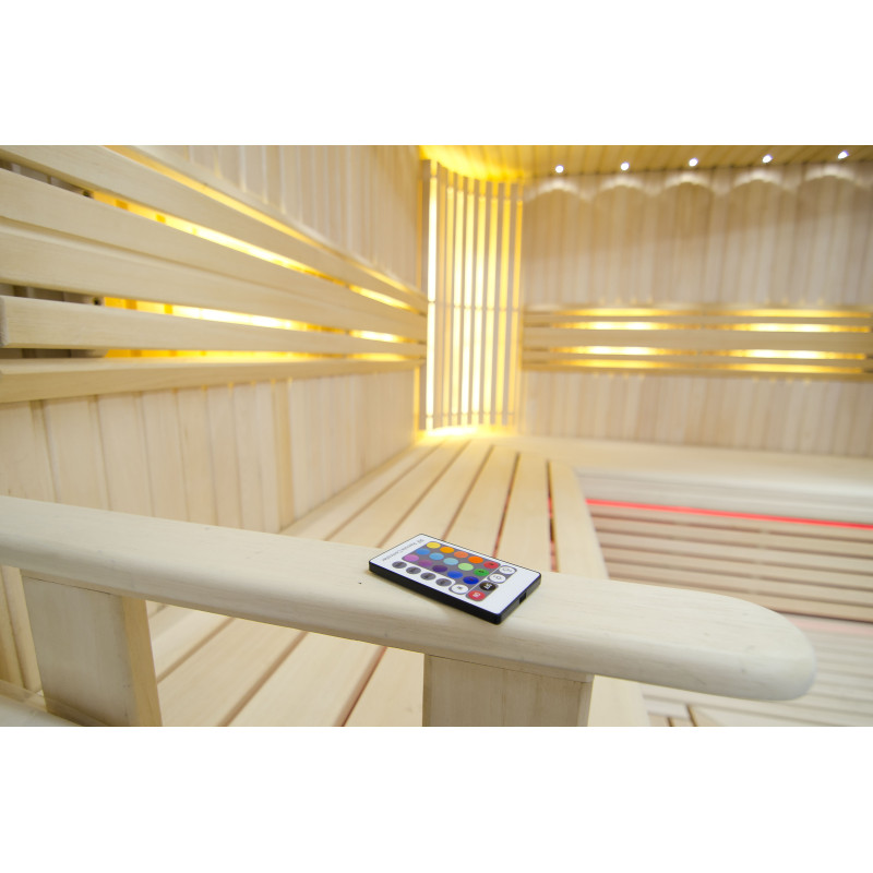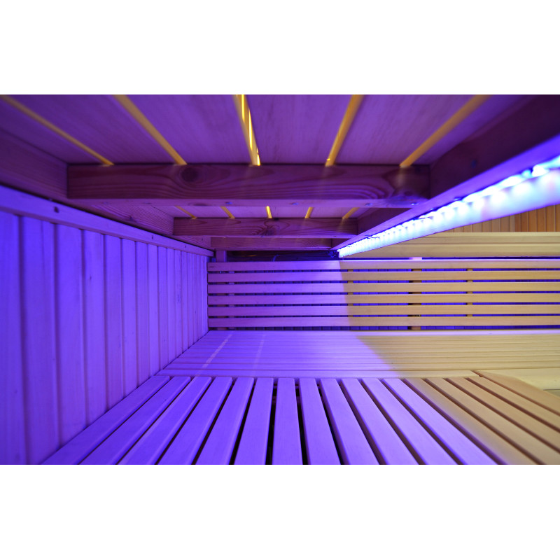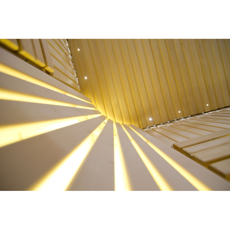 Strop je osvetlený bielym LED osvetlením "mesiac" - dobrou alternatívou k osvetleniu z optických vlákien. Na stenách pod operadlami - LED biele teplé osvetlenie, ktoré dokonale zvýrazňuje textúru dreva. Pod lavicami - LED RGB farebné osvetlenie, ktorého farby môžete jednoducho ovládať diaľkovým ovládačom a navodiť tak požadovanú atmosféru sauny.