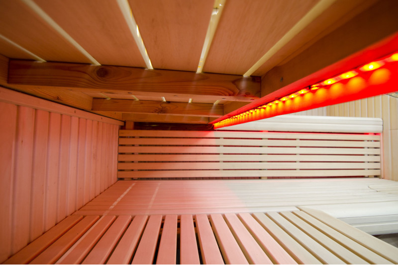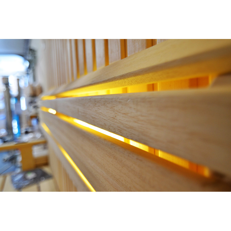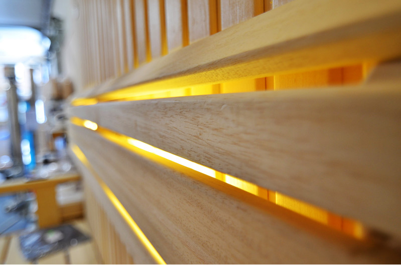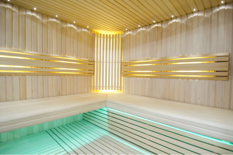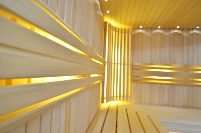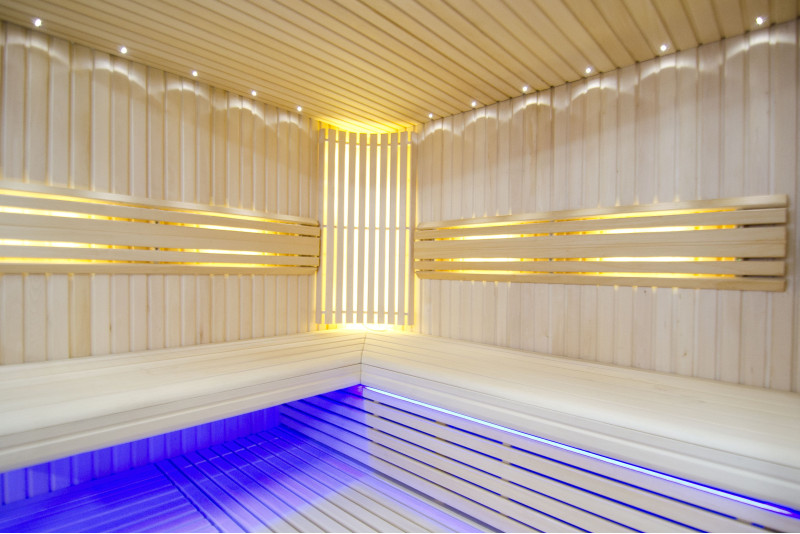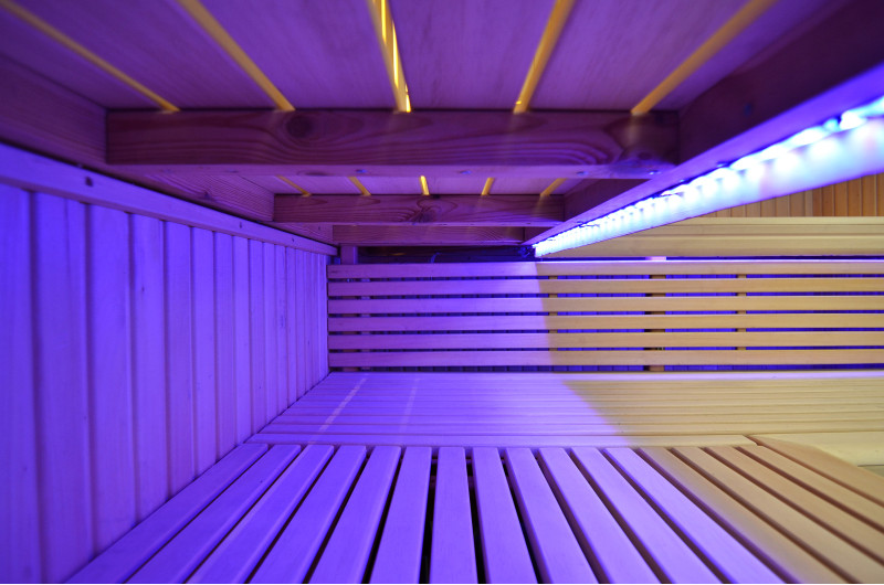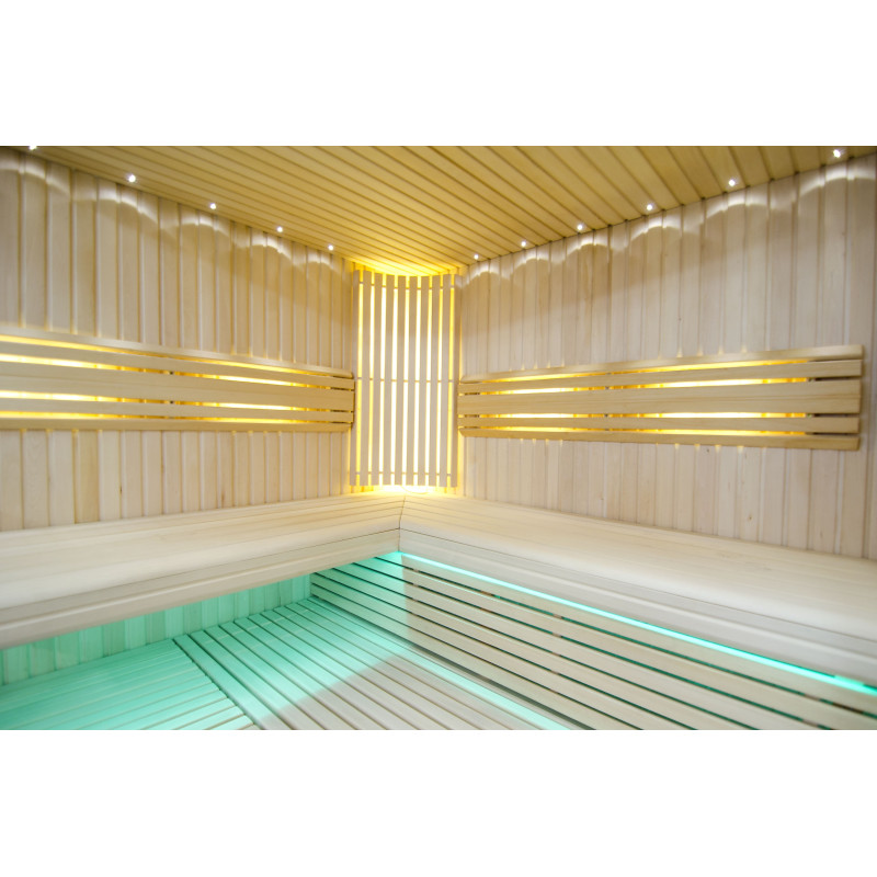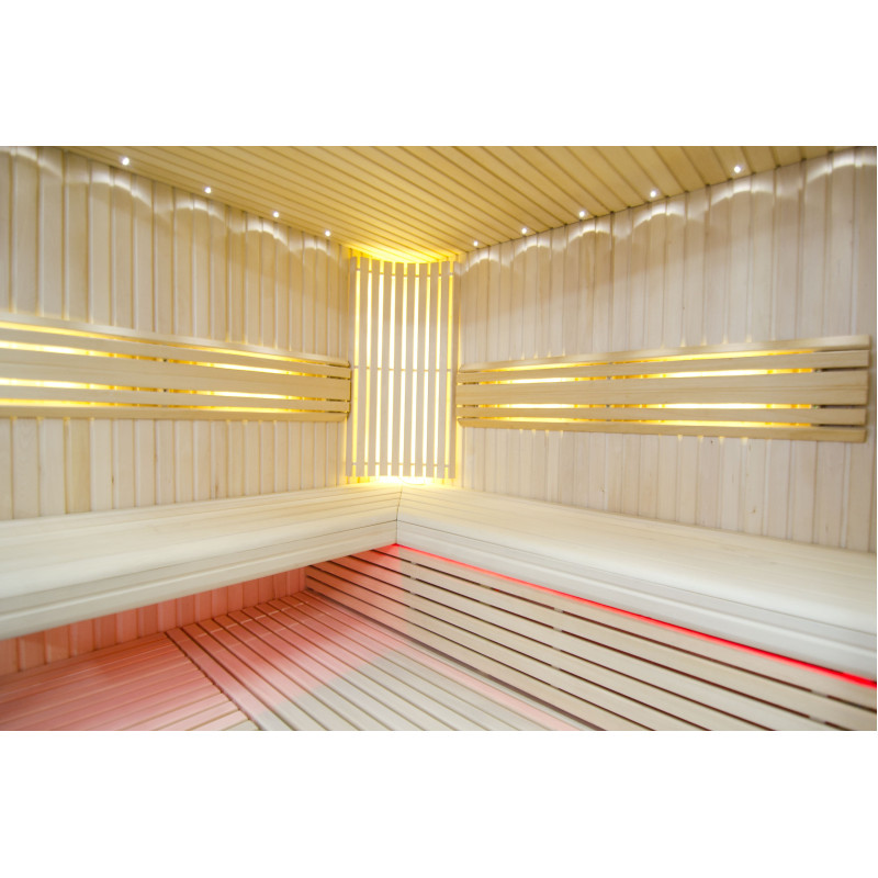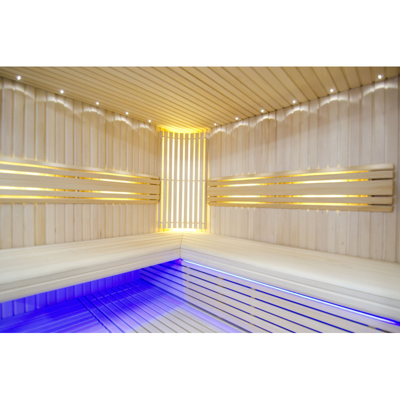 Strop je osvetlený bielym LED osvetlením "mesiac" - dobrou alternatívou k osvetleniu z optických vlákien. Na stenách pod operadlami - LED biele teplé osvetlenie, ktoré dokonale zvýrazňuje textúru dreva. Pod lavicami - LED RGB farebné osvetlenie, ktorého farby môžete jednoducho ovládať diaľkovým ovládačom a navodiť tak požadovanú atmosféru sauny.