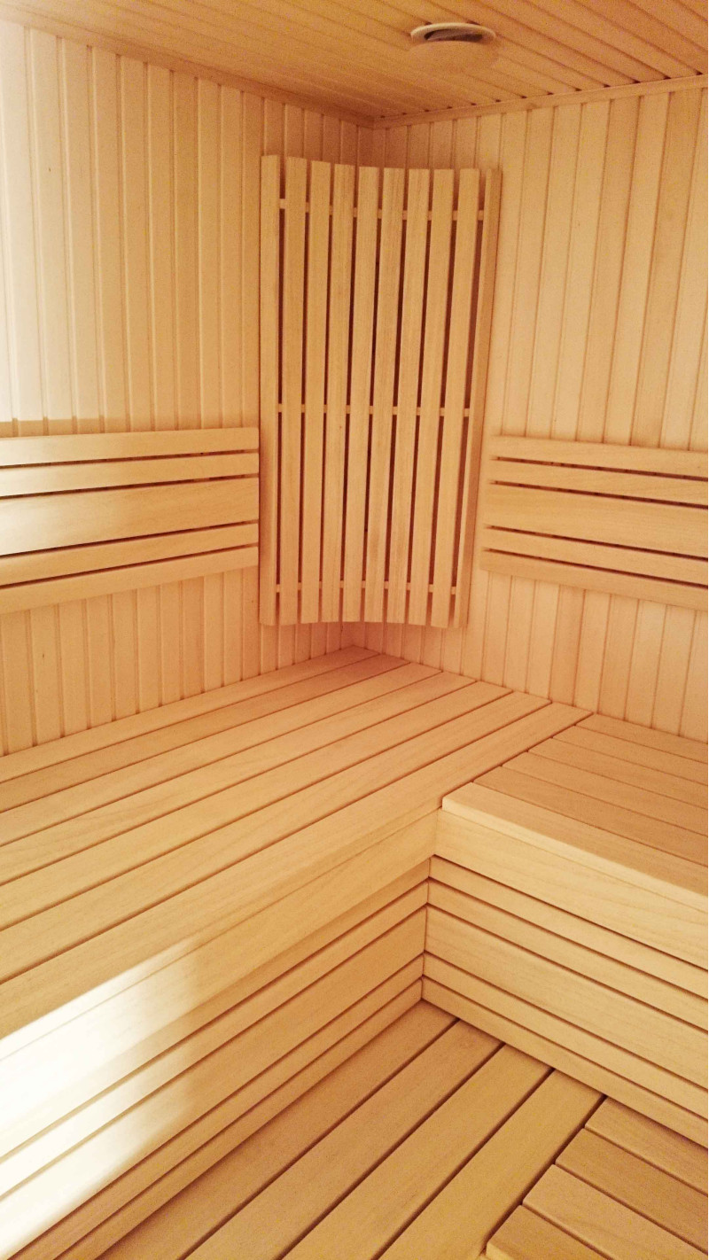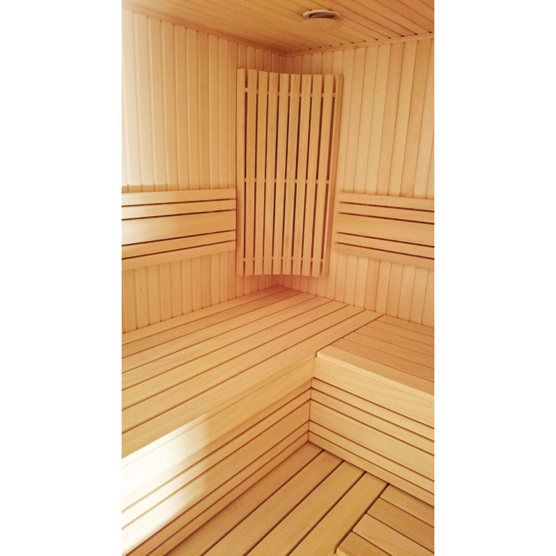 Stropy a steny sauny sú pokryté lipovou vlečkou, rovnako ako podpery, podlahové rošty a ohrievacie ploty. Lehátka do sauny sú z dreva abachi najvyššej kvality. Drevo na postele, podpery a steny je impregnované a lakované, olejované - špeciálne pripravené na použitie v teple a vlhkosti.