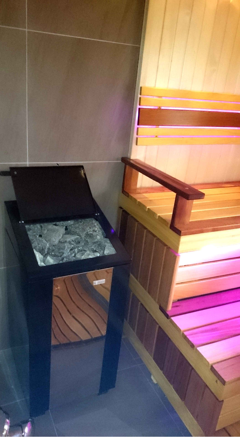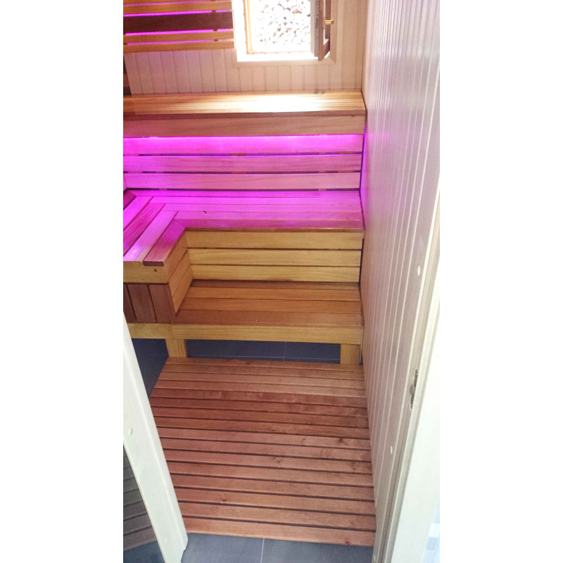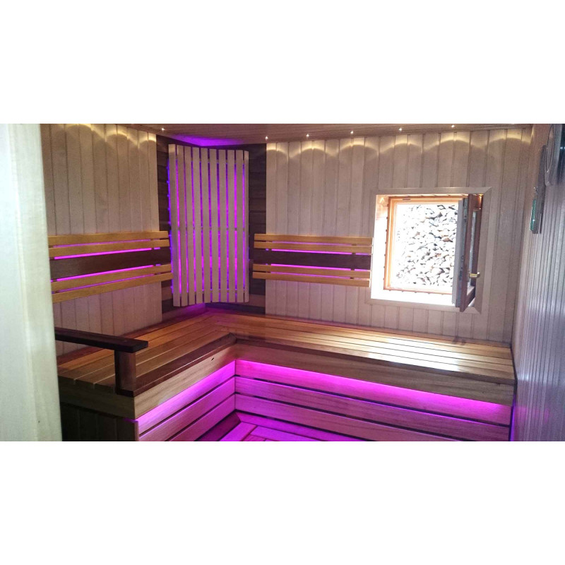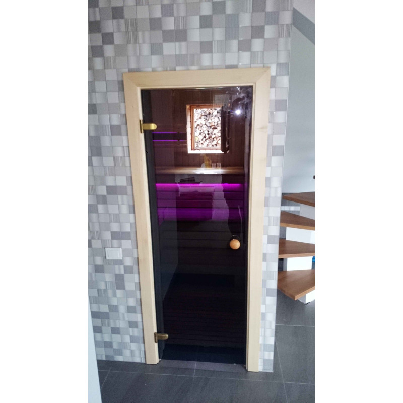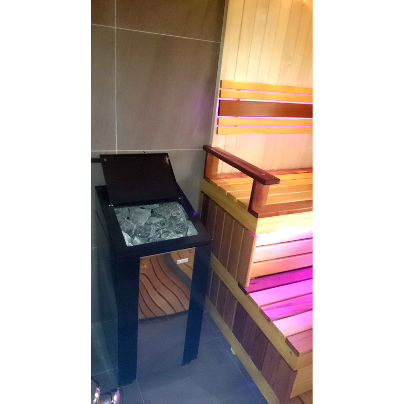 Lavičky do sauny a tienidlo sú vyrobené z dosiek z afrického dreva abachi. Toto kvalitné drevo sa zo všetkých najmenej zahrieva, preto je príjemné sa ho v saune dotýkať. Steny a stropy sú vyrobené z borovicového dreva. Okno v saune podporuje prúdenie prirodzeného svetla, rozširuje priestor a vytvára spojenie s prírodou. Okenné sklo - tvrdené, žiaruvzdorné, bronzové sklo.