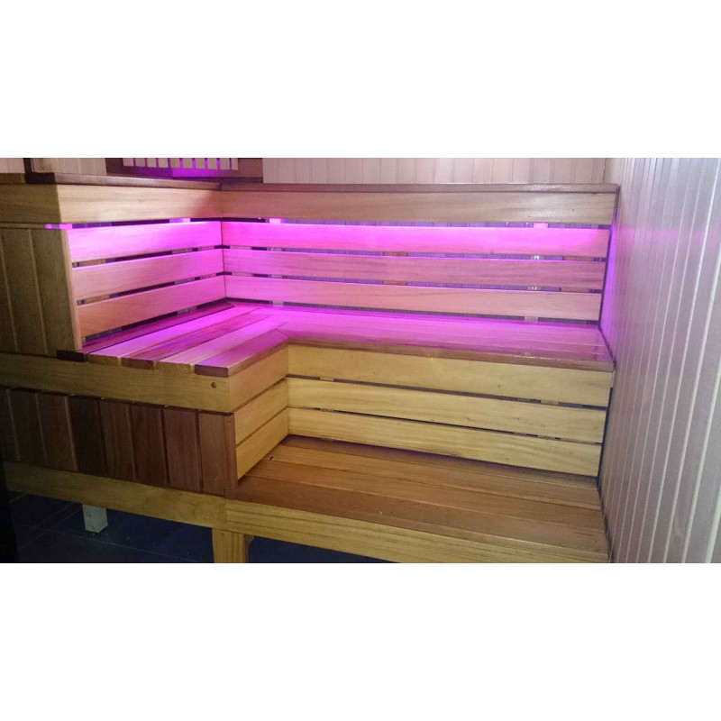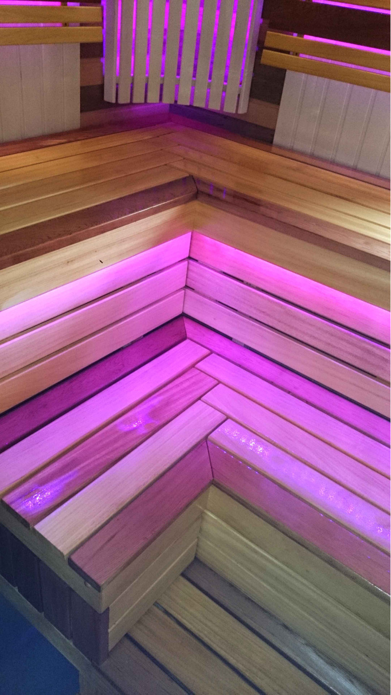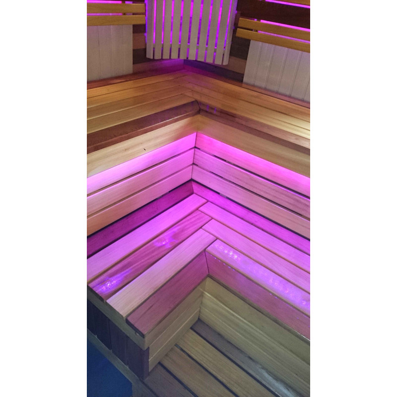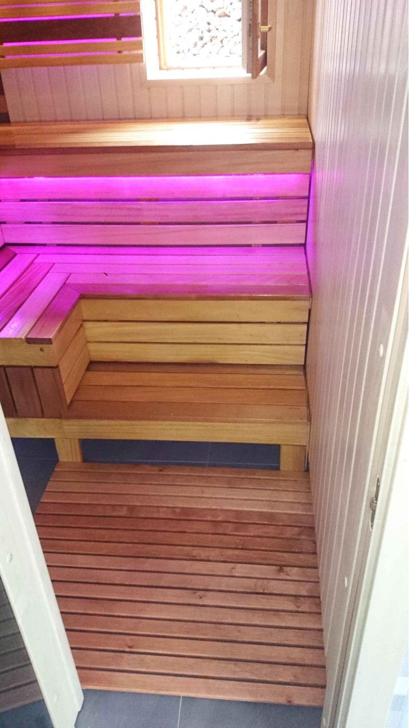 Lavičky do sauny a tienidlo sú vyrobené z dosiek z afrického dreva abachi. Toto kvalitné drevo sa zo všetkých najmenej zahrieva, preto je príjemné sa ho v saune dotýkať. Steny a stropy sú vyrobené z borovicového dreva. Okno v saune podporuje prúdenie prirodzeného svetla, rozširuje priestor a vytvára spojenie s prírodou. Okenné sklo - tvrdené, žiaruvzdorné, bronzové sklo.