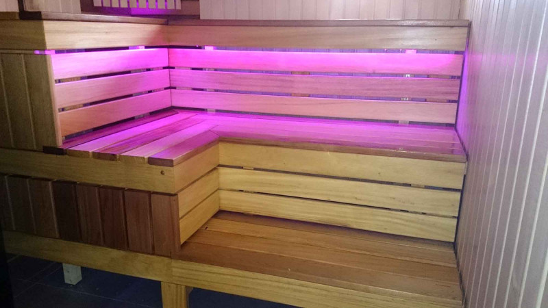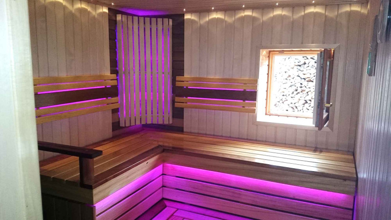 Sauna je vybavená ventilačným systémom. Farebné osvetlenie je nainštalované pod lavicami a za operadlami, čo vytvára útulné a upokojujúce prostredie. Závesná lampa Harvia s dreveným krytom abachi. Teplomer a vlhkomer Harvia, dve váhy.