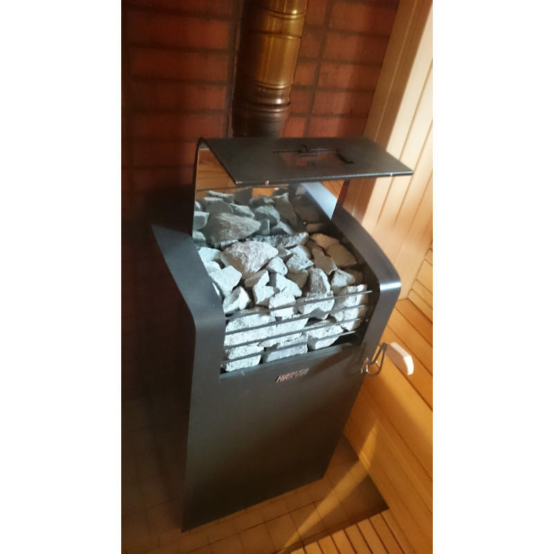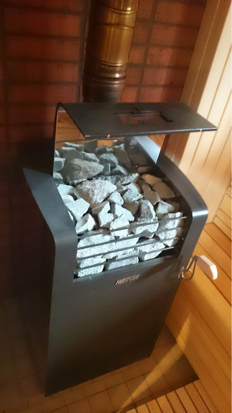 Pre správnu cirkuláciu vzduchu v saune je zabezpečená ventilácia a je inštalovaný komín s ohrievačom. Model ohrievača je uzavretého typu, ktorý akumuluje teplo a vydáva veľa pary. Počas zahrievania je veko zatvorené, nalievanie vody na kamene - je otvorené.