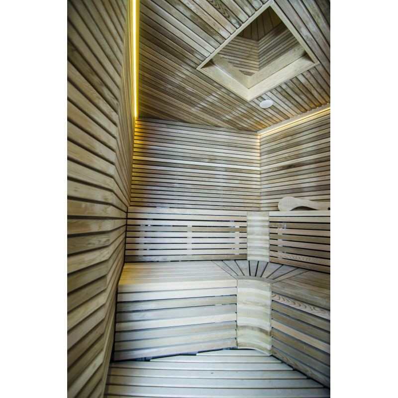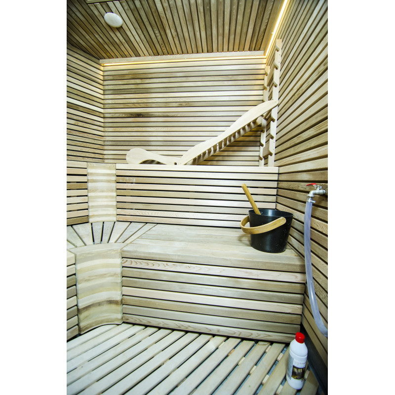 Osvetlenie - teplý biely LED pásik. Strop je vybavený lešteným nerezovým plechom, ktorý je vybavený systémom osvetlenia "Starry Sky". Je to ideálne riešenie osvetlenia vašej sauny alebo inej tmavej miestnosti.
