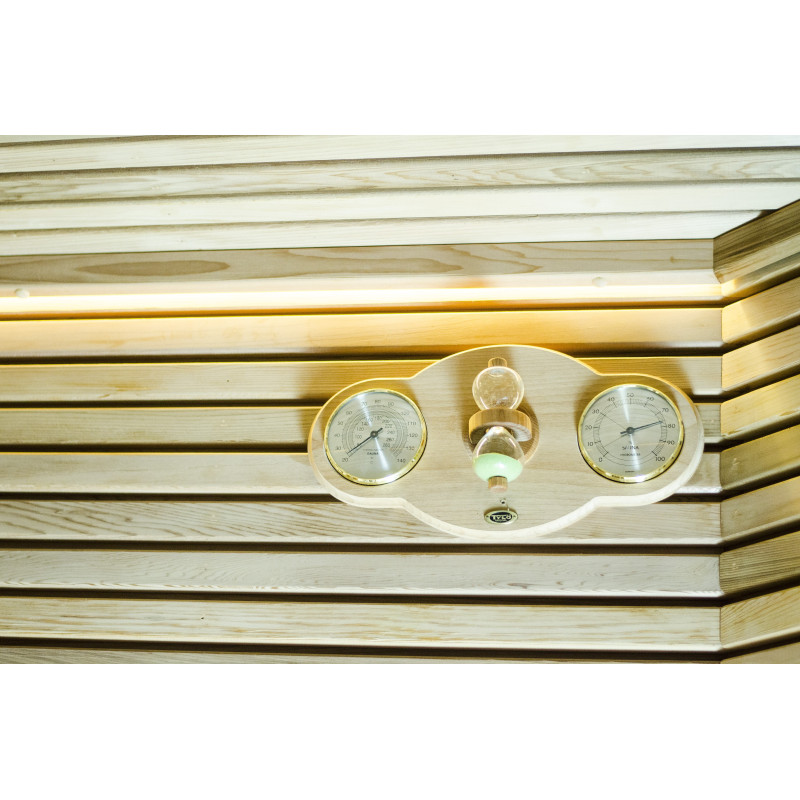 Doplnky do sauny: súprava vedra a naberačky, drevený teplomer s vlhkomerom a presýpacie hodiny.