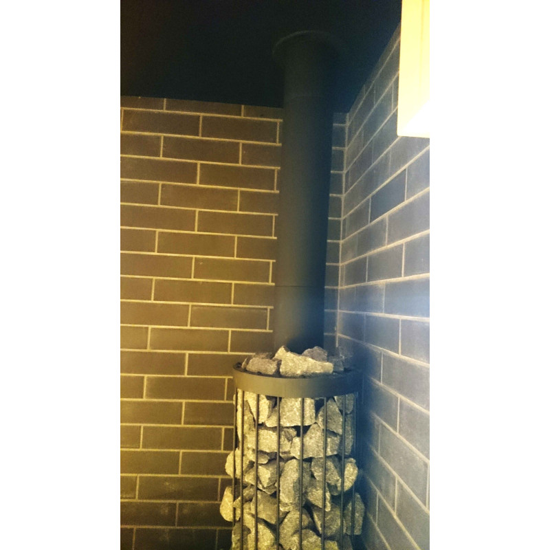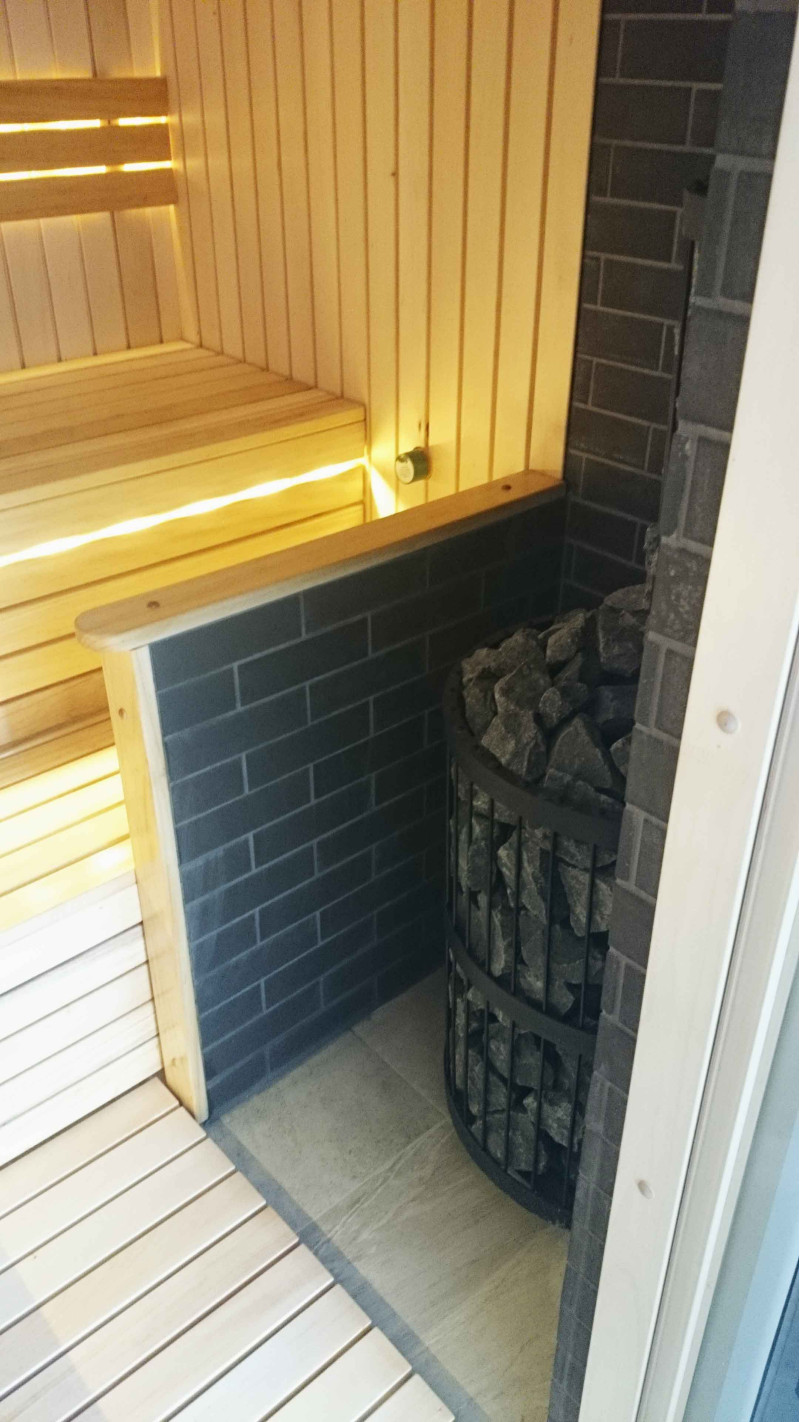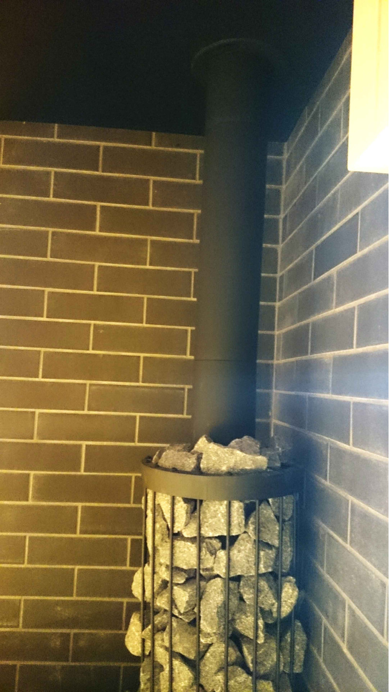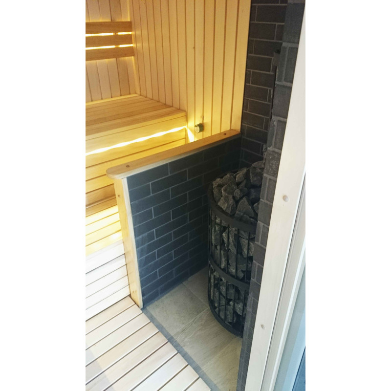 Tento projekt sauny s ochrannou stenou pre ohrievač. Stena je vyrobená zo žiaruvzdornej dosky Minerit na kovovom ráme.