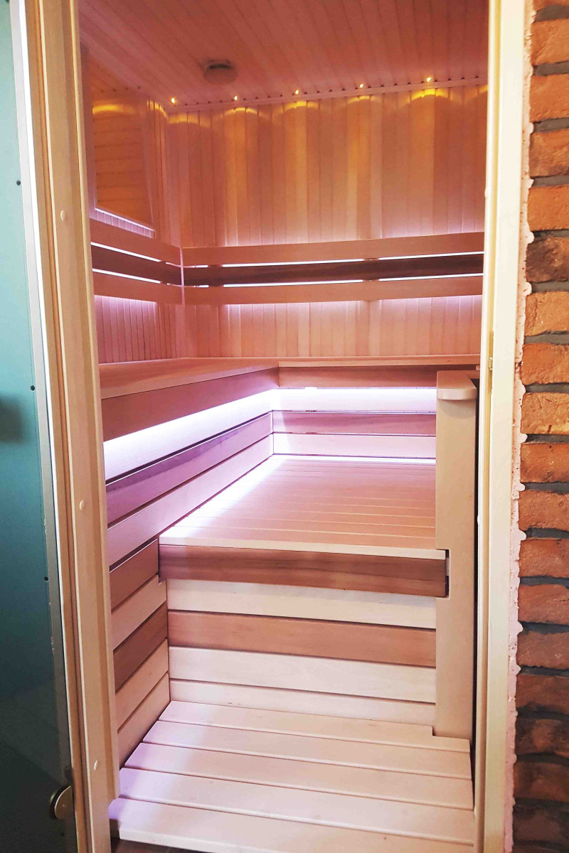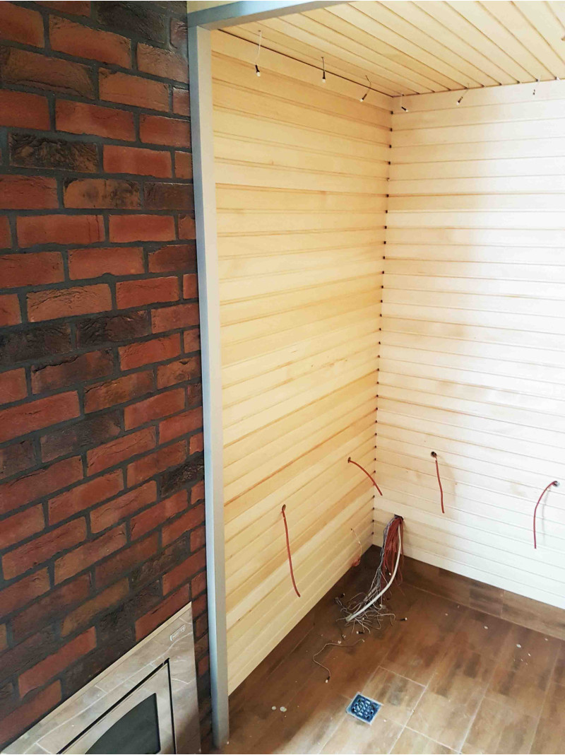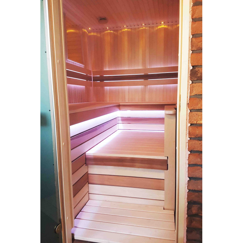 Je nainštalované osvetlenie sauny odolné voči vlhkosti a teplu - LED "Slnko". Pod lehátkami a v operadlách - farebné RGB osvetlenie ovládané diaľkovým meničom farieb.