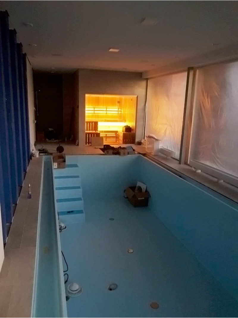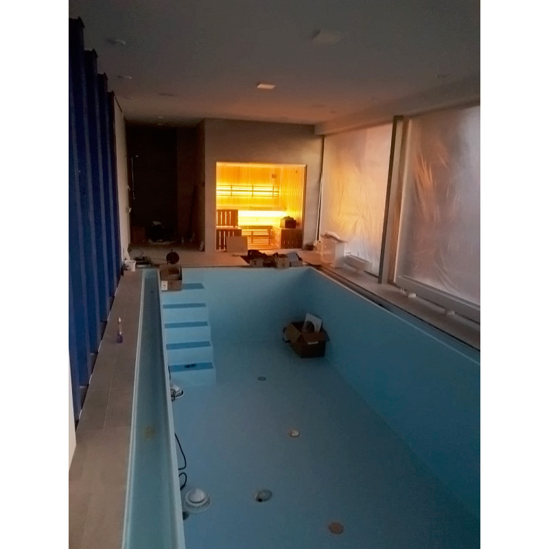 Osadenie sklenenej vitríny - tónované 8mm tvrdené sklo v hliníkovom ráme. Vďaka presklenej vitríne sa otvára pohľad na bazénovú časť, zväčšuje sa malá saunová miestnosť a sauna je presvetlená.