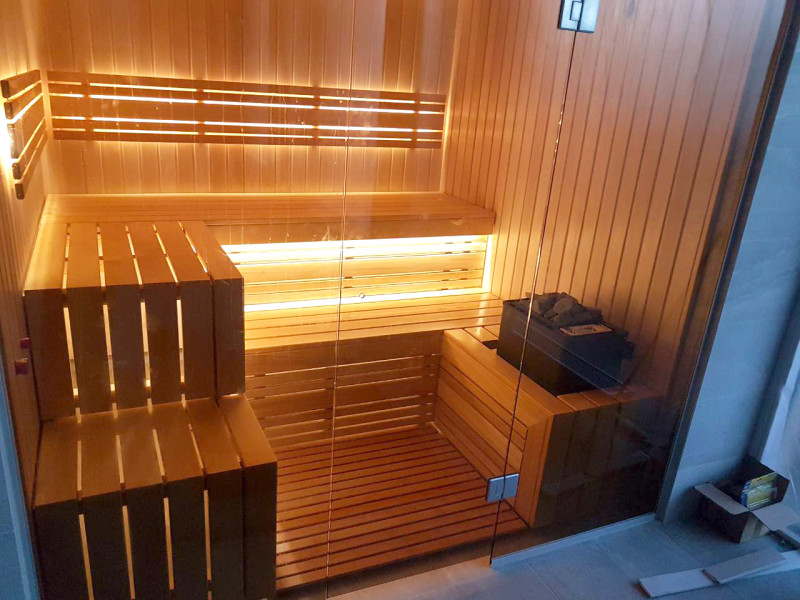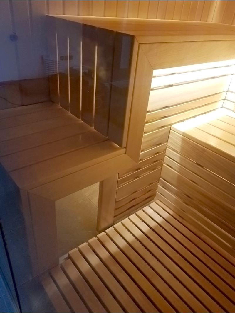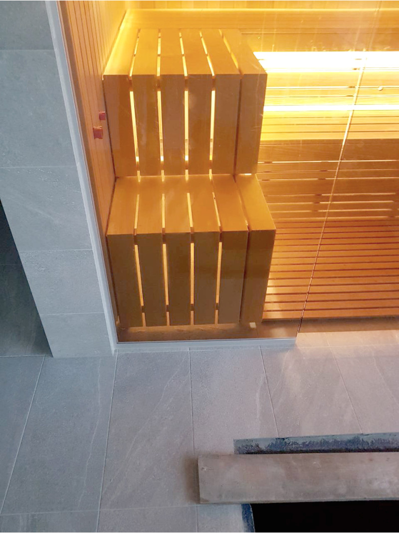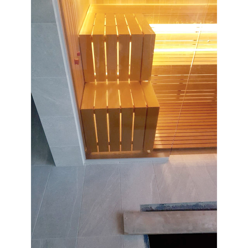 Na steny a strop sauny bol použitý ľahký lipový obklad. Tieto obklady vyžarujú príjemnú, prirodzenú vôňu dreva, nekrčia sa žiarom a nestrácajú svoj elegantný vzhľad.