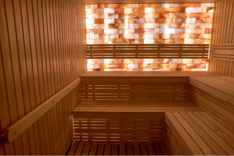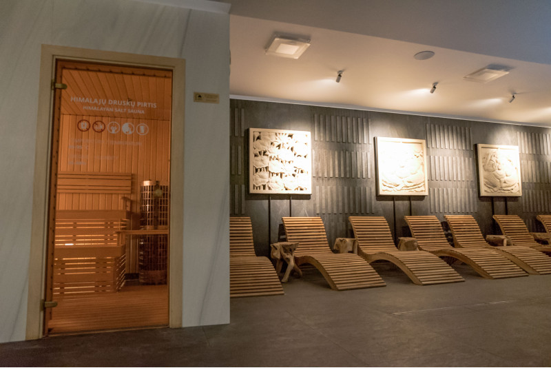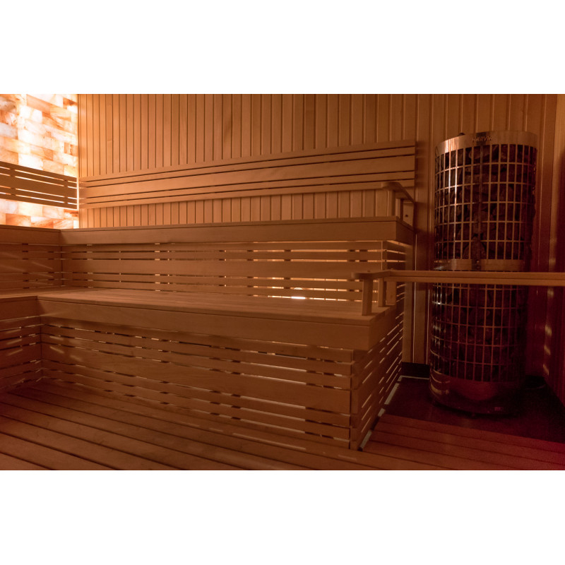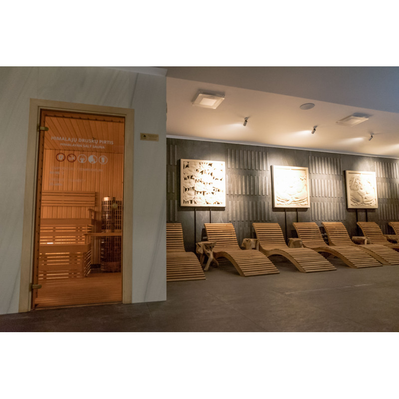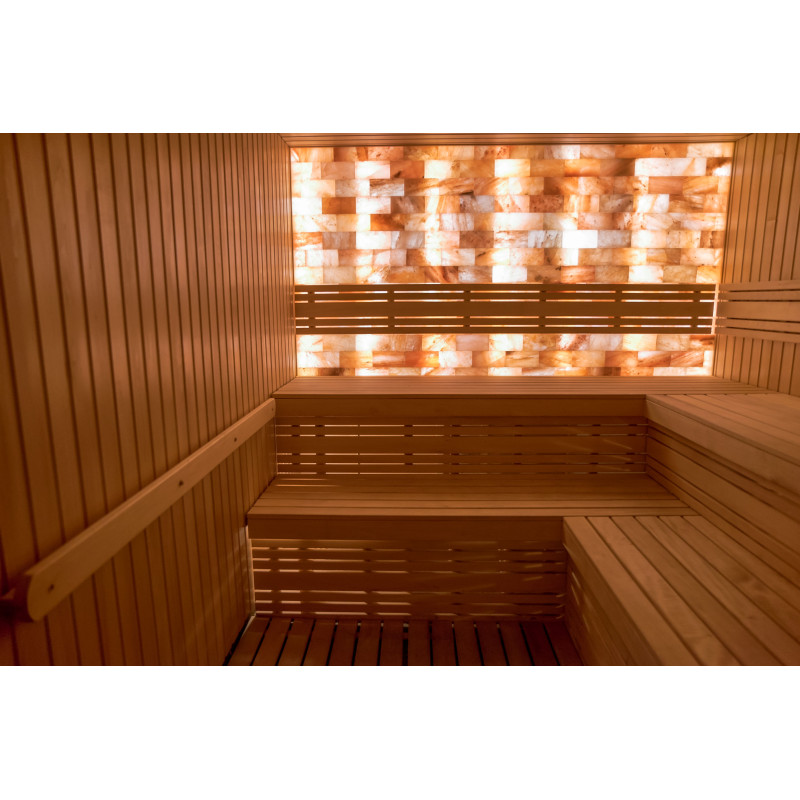 Hlavným vrcholom sauny je pôsobivá a moderne vyzerajúca stena z himalájskych soľných tehál. Táto stena nadchne nielen svojím vzhľadom, dodá saune útulnú atmosféru, ale je tiež známe, že himalájska soľ má mnoho pozitívnych vlastností pre ľudské zdravie. Himalájska soľ priaznivo pôsobí na ľudí s alergiami, bronchiálnou astmou, chorobami nervového systému, posilňuje imunitný systém, zvyšuje náladu a dodáva energiu. Himalájska soľ neutralizuje elektromagnetické žiarenie, čím znižuje statickú elektrinu vo vzduchu. Himalájsku soľnú stenu len viac zvýrazňuje a skrášľuje zabudované LED osvetlenie pod tehlami.