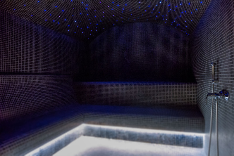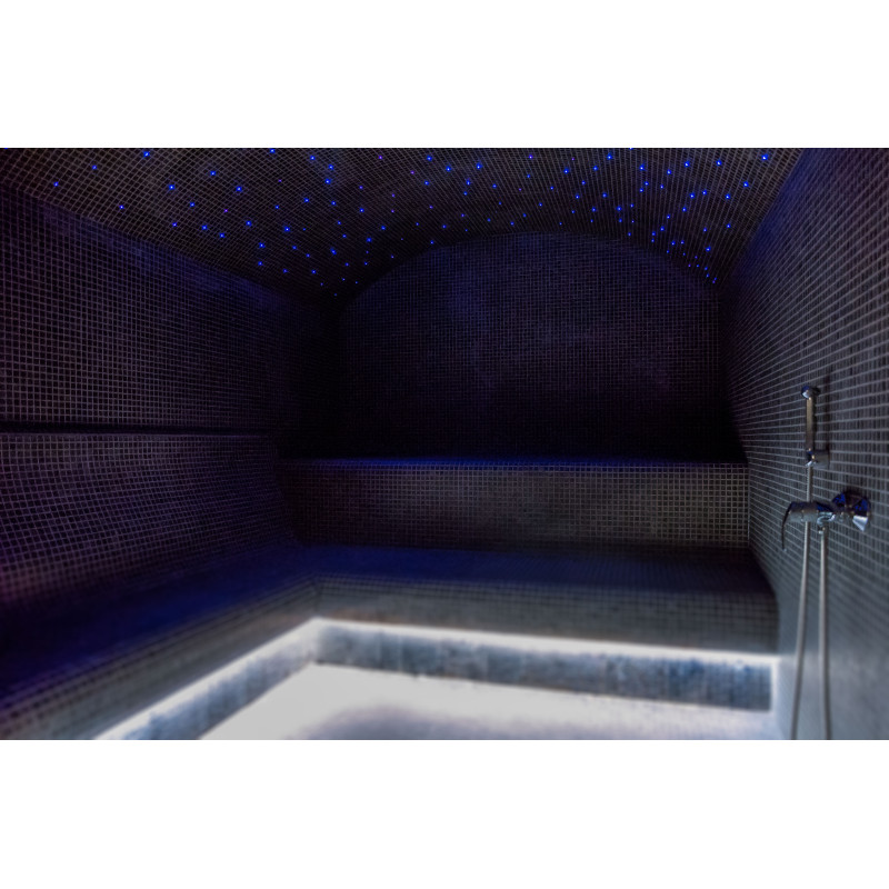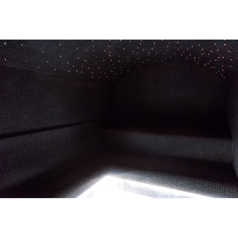 V parnej saune sú povrchy z penového polystyrénu, stropné oblúky a lavice vyrobené podľa individuálneho projektu. Saunu si môžete vychutnať v ľahu aj v sede, keďže na jednej strane sauny je operadlo.
