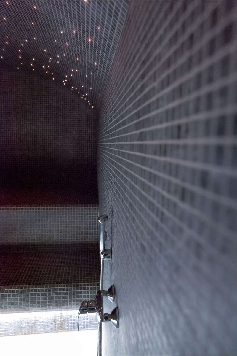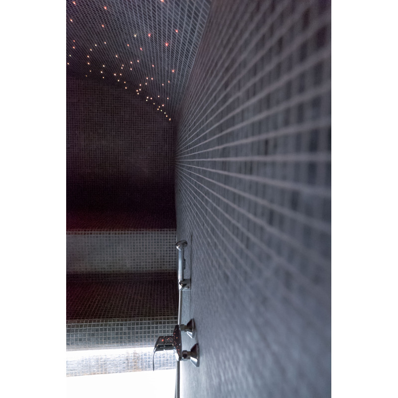 Celá miestnosť sauny je zdobená malými mozaikovými dlaždicami a dva hudobné reproduktory vytvárajú pokojnú a útulnú atmosféru.