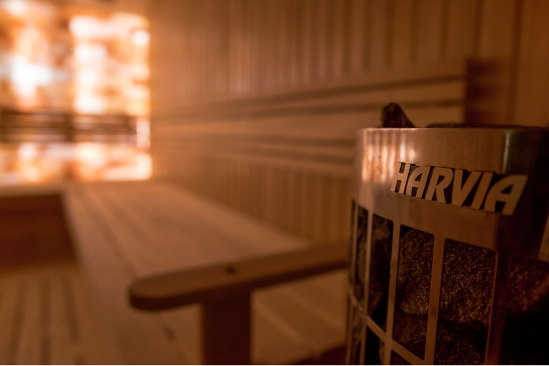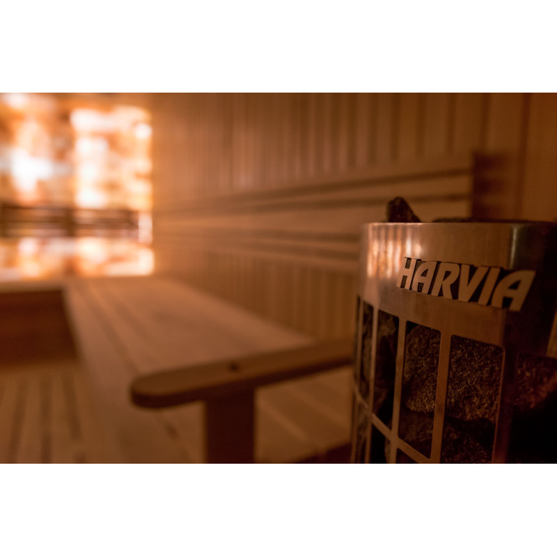 Výbava - ohrievač Harvia, ktorý pojme obzvlášť veľké množstvo kamienkov, takže si užijete bohatú a príjemnú paru.