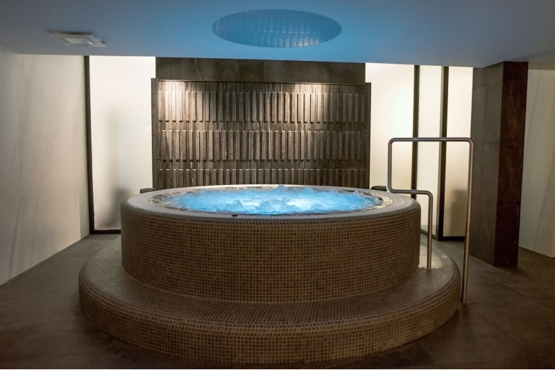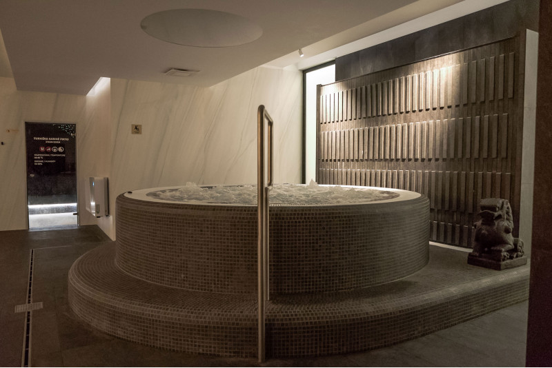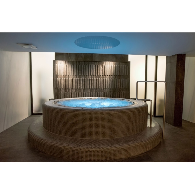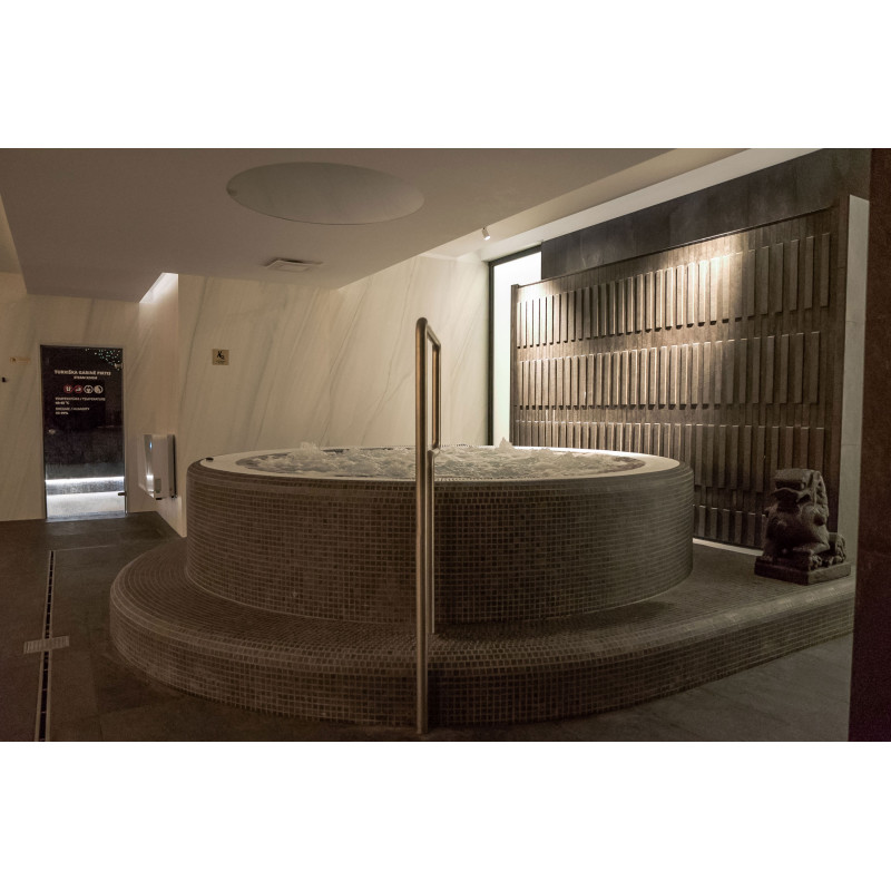 K dispozícii je priestranný hydromasážny bazén, ktorého formy sú vyrobené z penového polystyrénu na individuálnu objednávku. Bazén je pokrytý malými mozaikovými dlaždicami, ktoré ladia s neutrálnym farebným interiérom. Okolo bazéna je schodík, nerezové madlo pre ľahký a bezpečný vstup do bazéna.