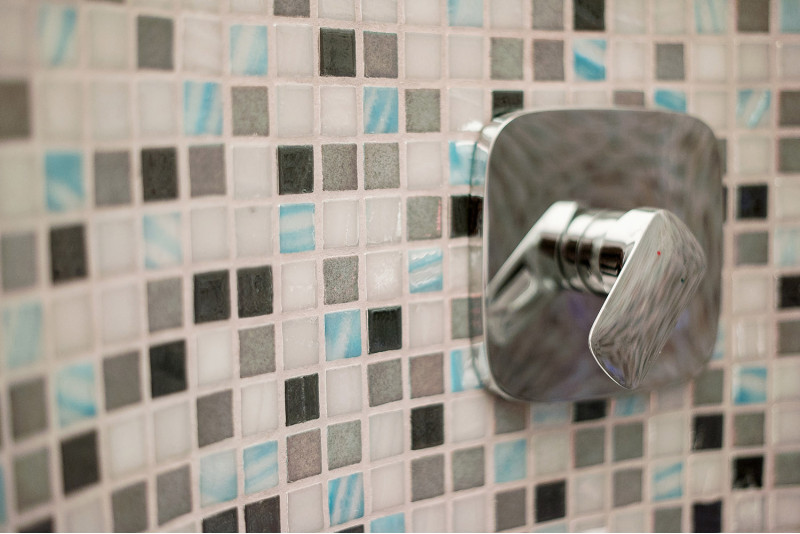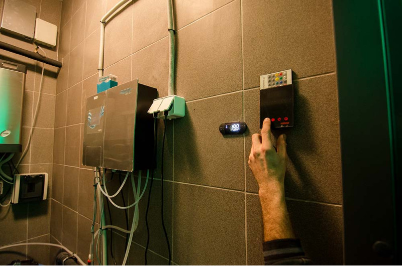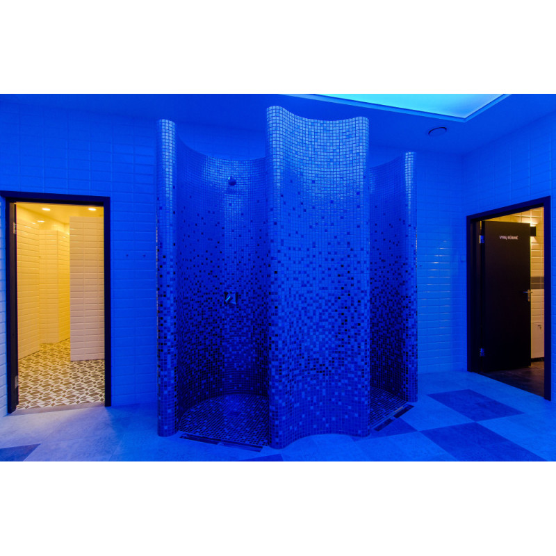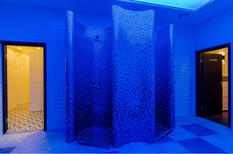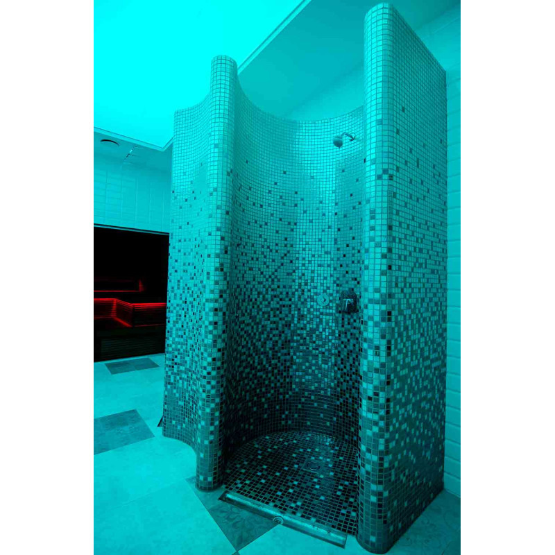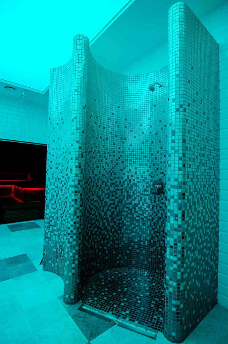 Sprchové formy sú vyrobené z XPS 300, s použitím spec. technológia rezania podľa individuálneho návrhu. Formy namontované, vodotesné pomocou hydroizolácie mazanej Schonox. Lepené mozaikové dlaždice, prispôsobené zakriveniu a vyplnené sivou hydroizoláciou Schonox. Sprchy - na rôzne účely. Jeden z nich - na jednoduché umytie, druhý - na ochladenie po saune, s bočnými tryskami so studenou vodou.