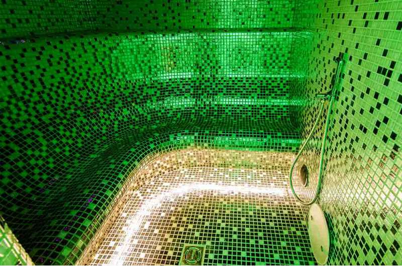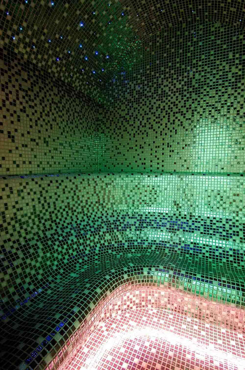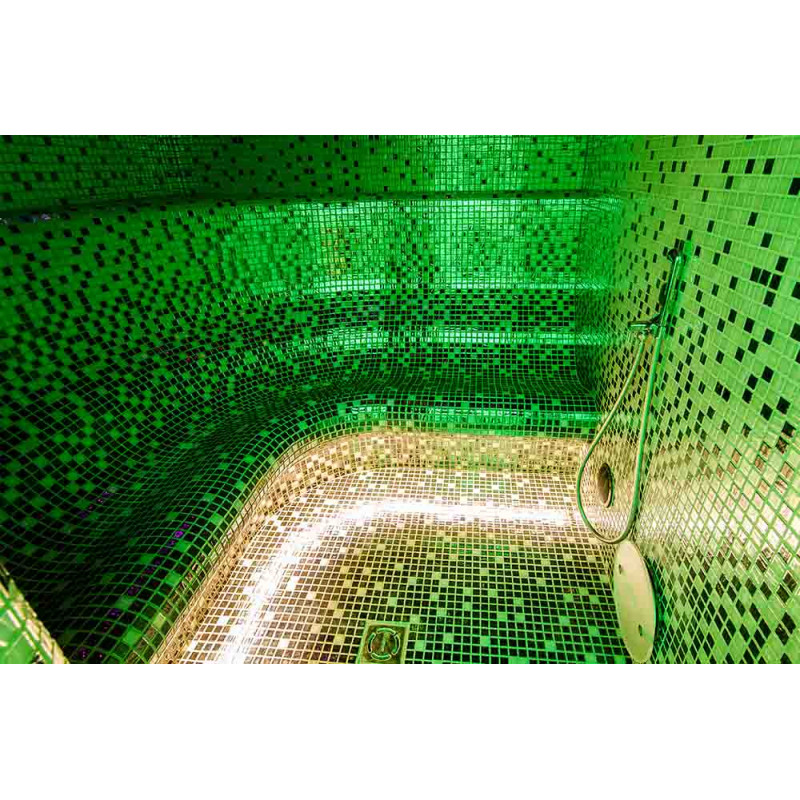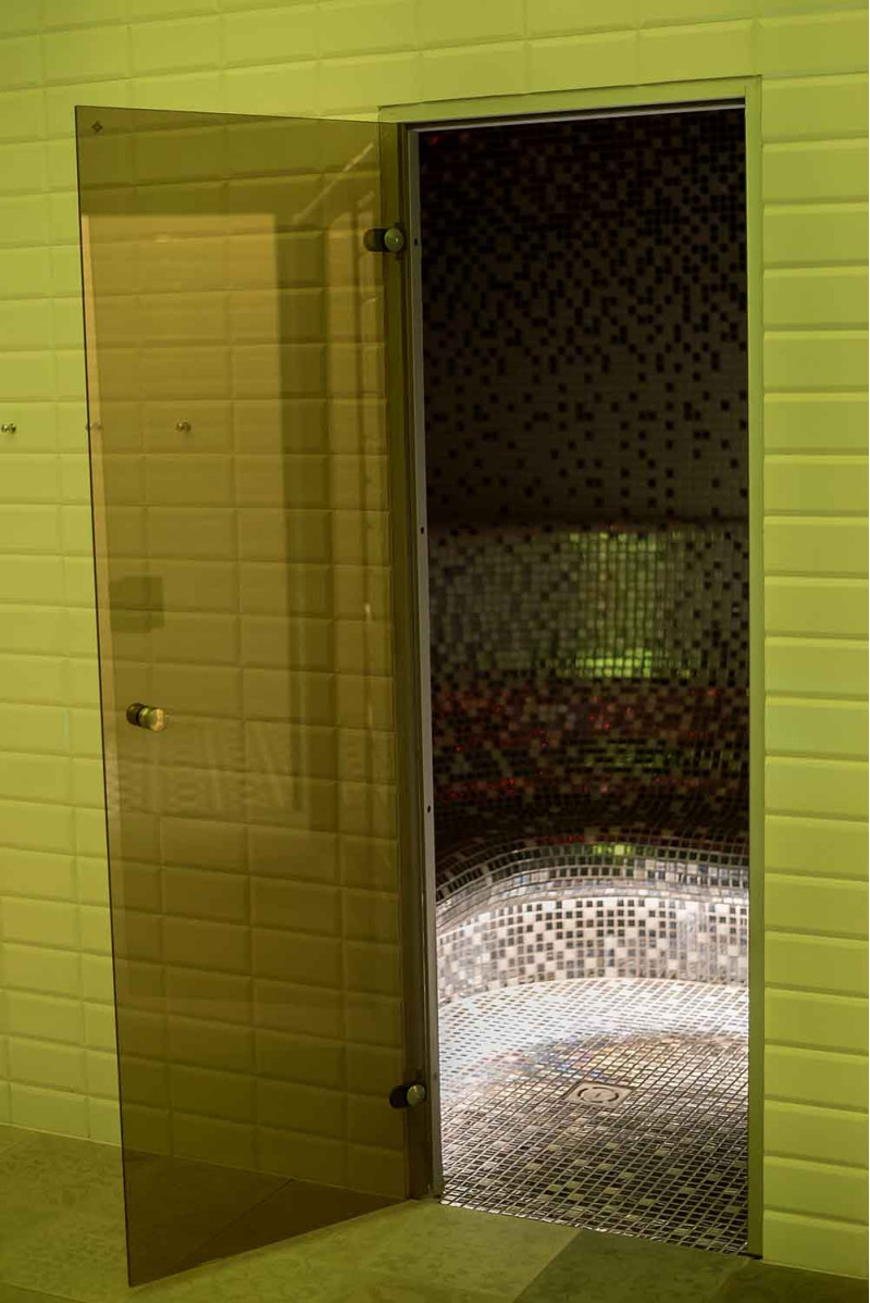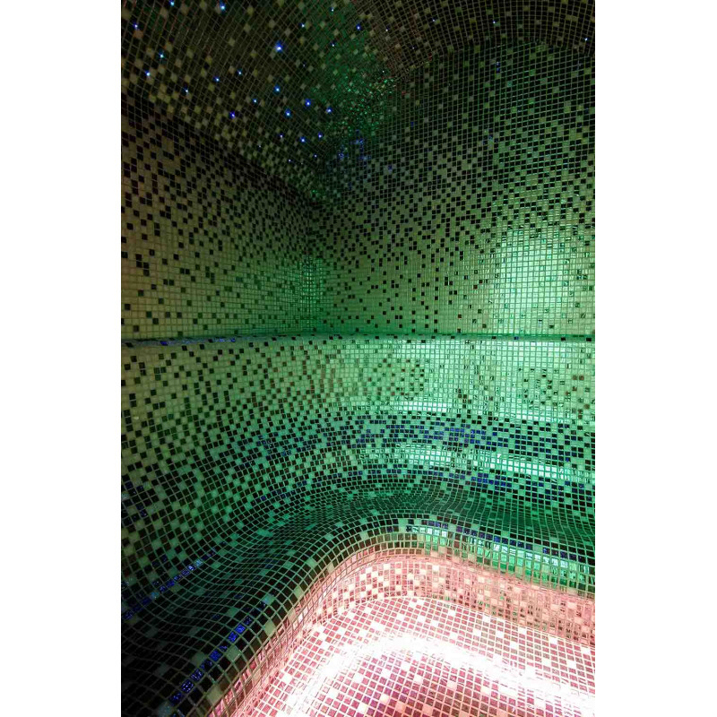 Vnútorné povrchy parného kúpeľa sú tvorené podľa individuálneho projektu z expandovaného polystyrénu pomocou kontinuálneho rezania EPS styrénu. Lepené mozaikové dlaždice, prispôsobené zakriveniu a vyplnené sivou hydroizoláciou Schonox. Podlaha miestnosti je vyhrievaná. Dvere - hliníkový rám, tvrdené tónované sklo. Zariadenie parného kúpeľa: