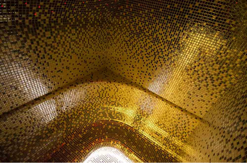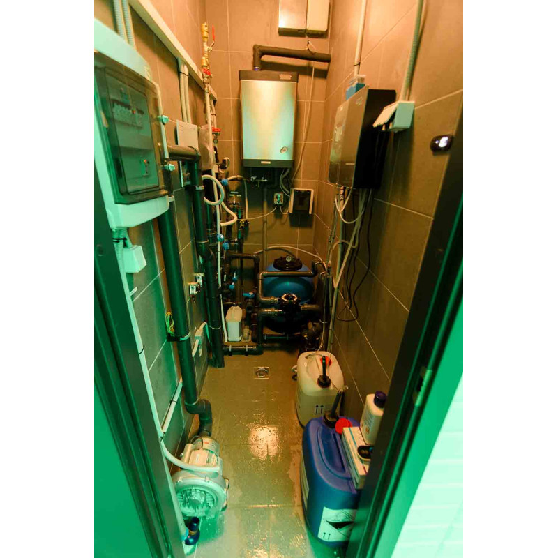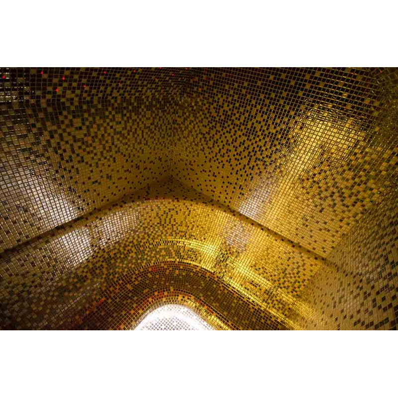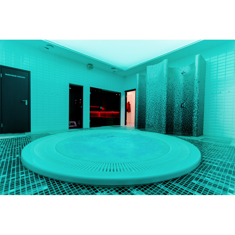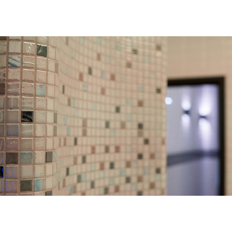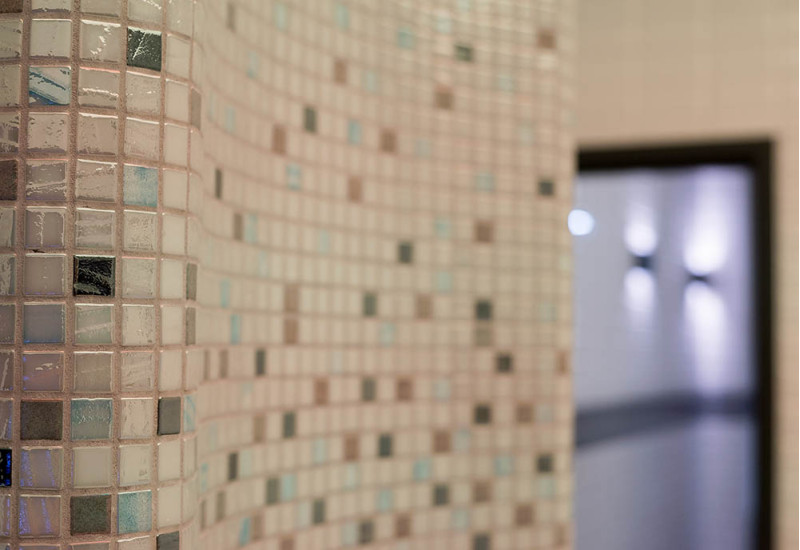 Vnútorné povrchy parného kúpeľa sú tvorené podľa individuálneho projektu z expandovaného polystyrénu pomocou kontinuálneho rezania EPS styrénu. Lepené mozaikové dlaždice, prispôsobené zakriveniu a vyplnené sivou hydroizoláciou Schonox. Podlaha miestnosti je vyhrievaná. Dvere - hliníkový rám, tvrdené tónované sklo. Zariadenie parného kúpeľa: