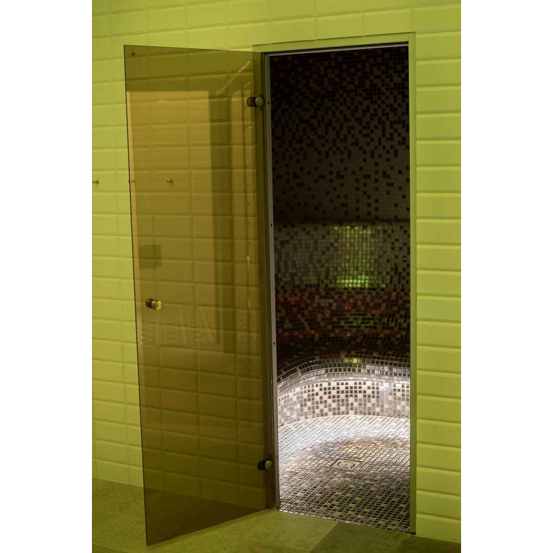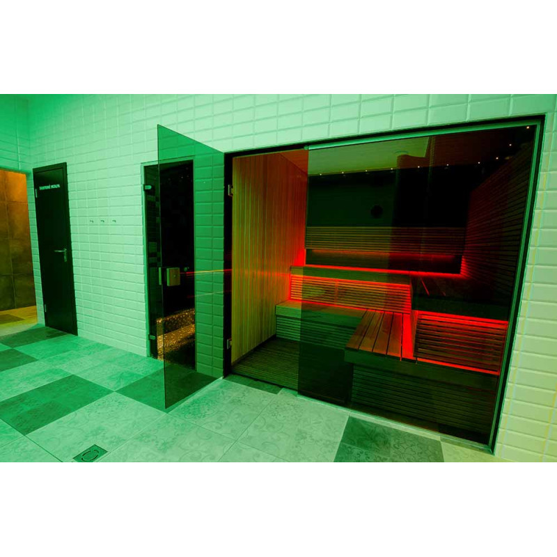 - sklenená vitrína inštalovaná v saune vytvára bezproblémový štýl, rozširuje priestor a vytvára dojem ľahkosti, dodáva miestnosti svetlo a modernosť. Sklenená vitrína - tónovaný, tvrdený, hliníkový rám,