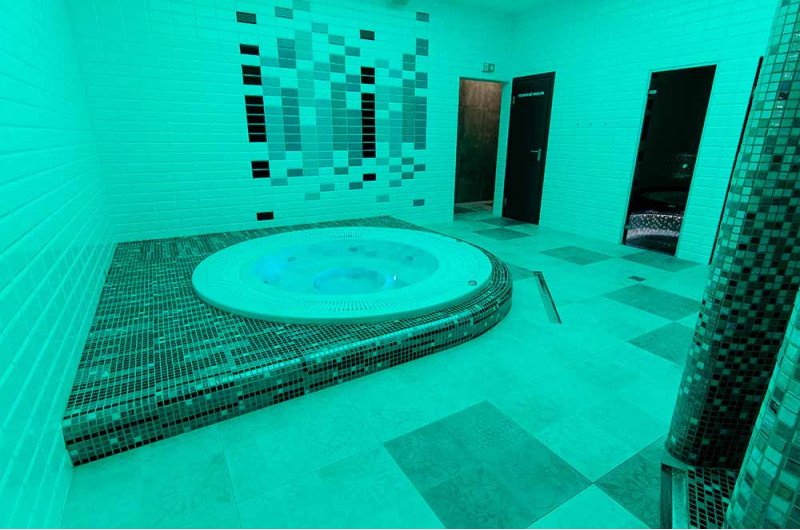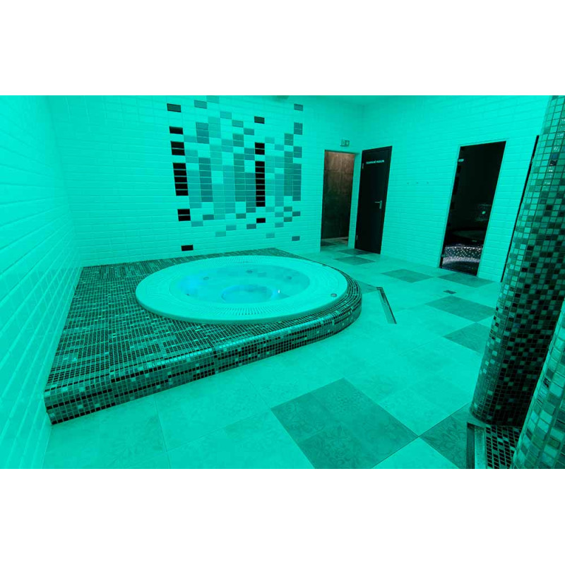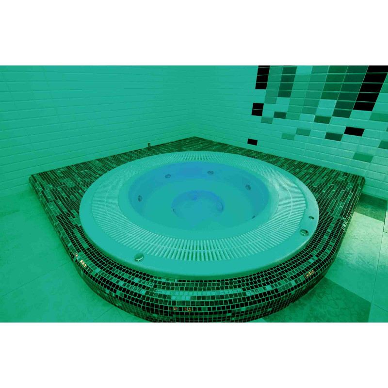 Hydromasážny bazén - komerčný. Dlaždice okolo bazéna - sklenená mozaika. Vybavenie: