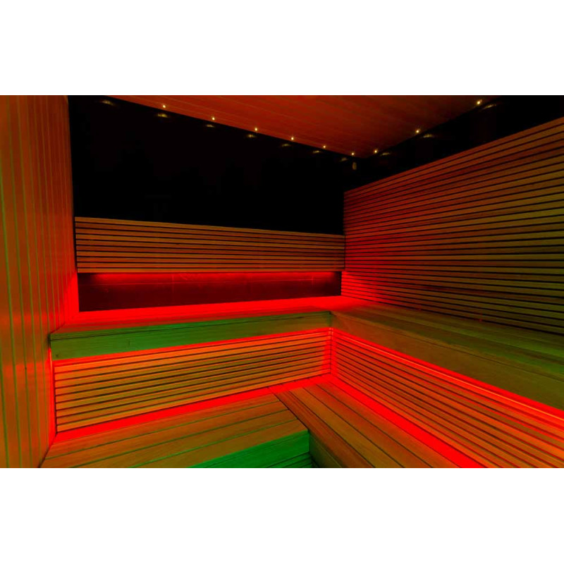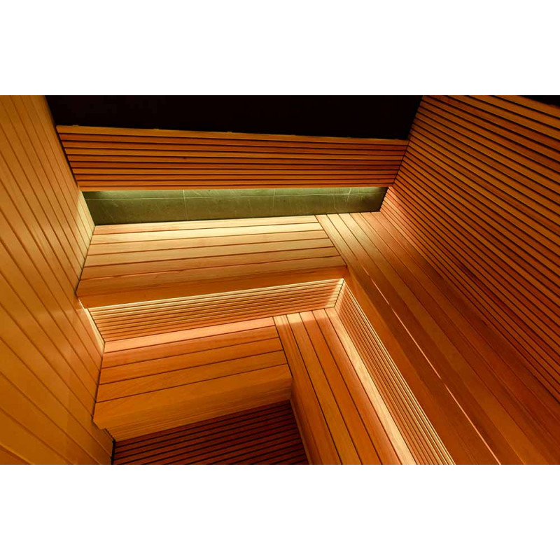 - okrem skvelého výhľadu je potešenie zo sauny umocnené aj zvukom - reproduktory inštalované pod saunovými lôžkami sú odolné voči saune, korózii a teplote,